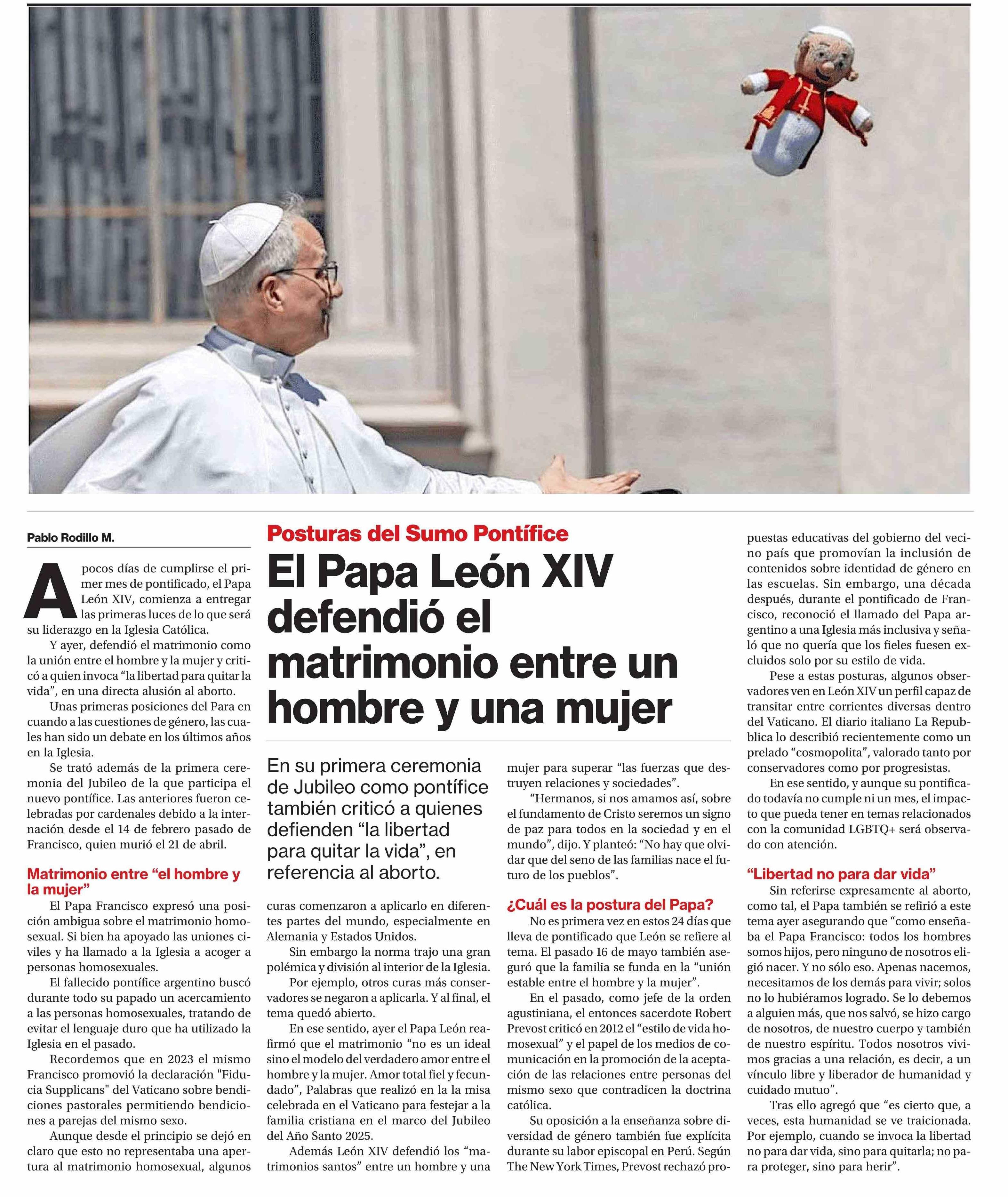 El Papa León XIV defendió el matrimonio entre un hombre y una mujer 02-06-2025 La Segunda |