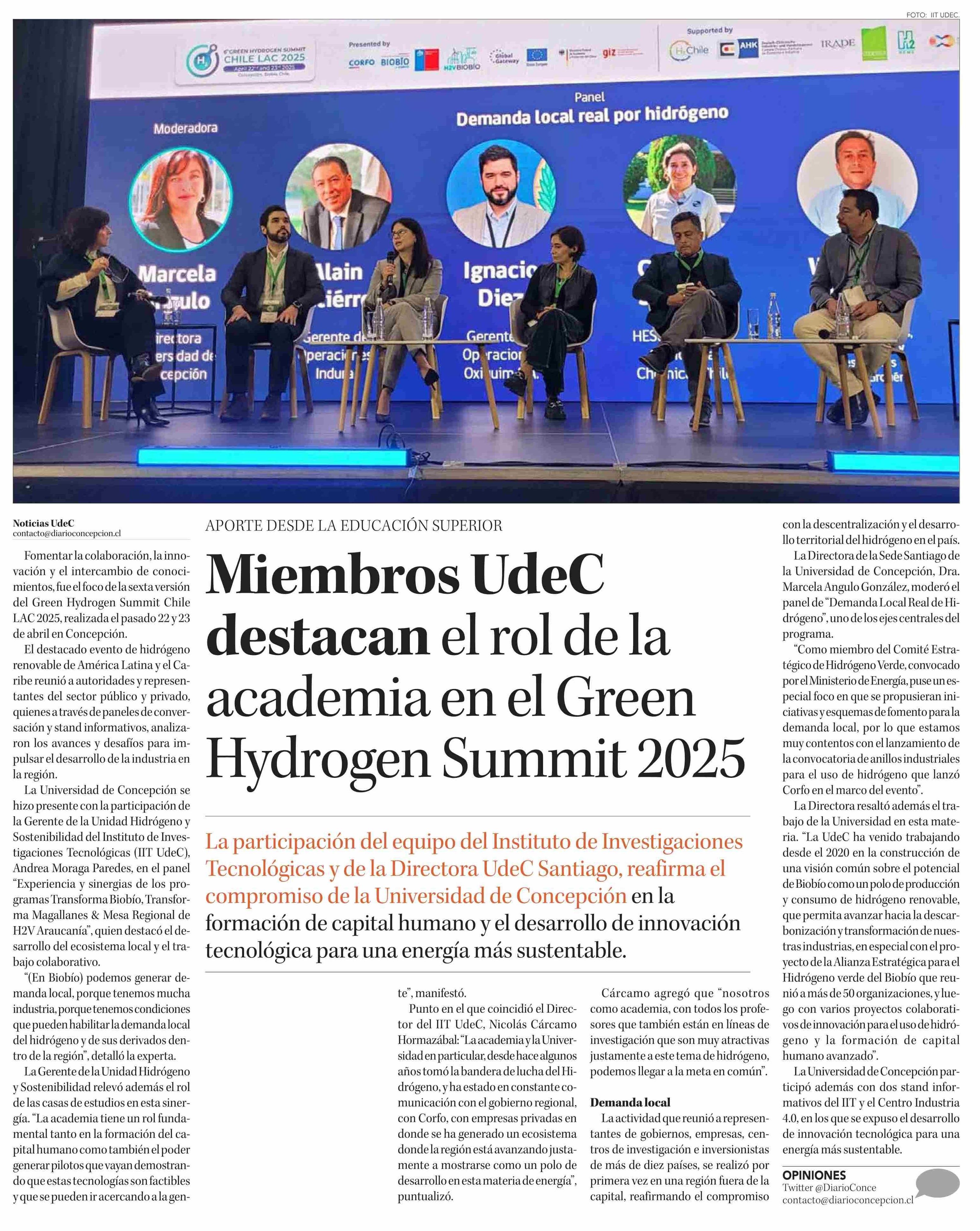 Miembros UdeC destacan el rol de la academia en el Green Hydrogen Summit 2025 28-04-2025 Diario Concepción |