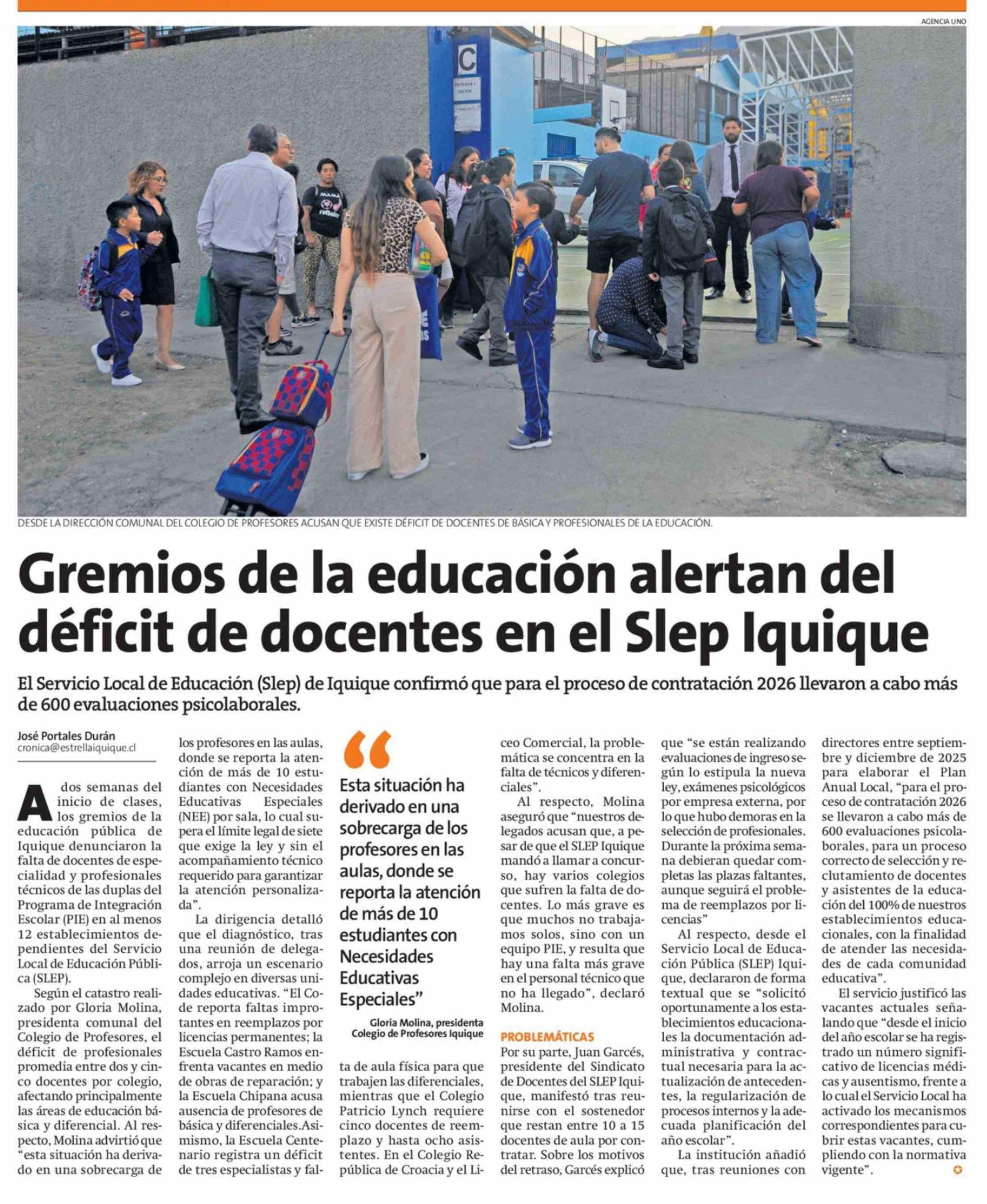 Gremios de la educación alertan del déficit de docentes en el Slep Iquique 16-03-2026 La Estrella de Iquique |