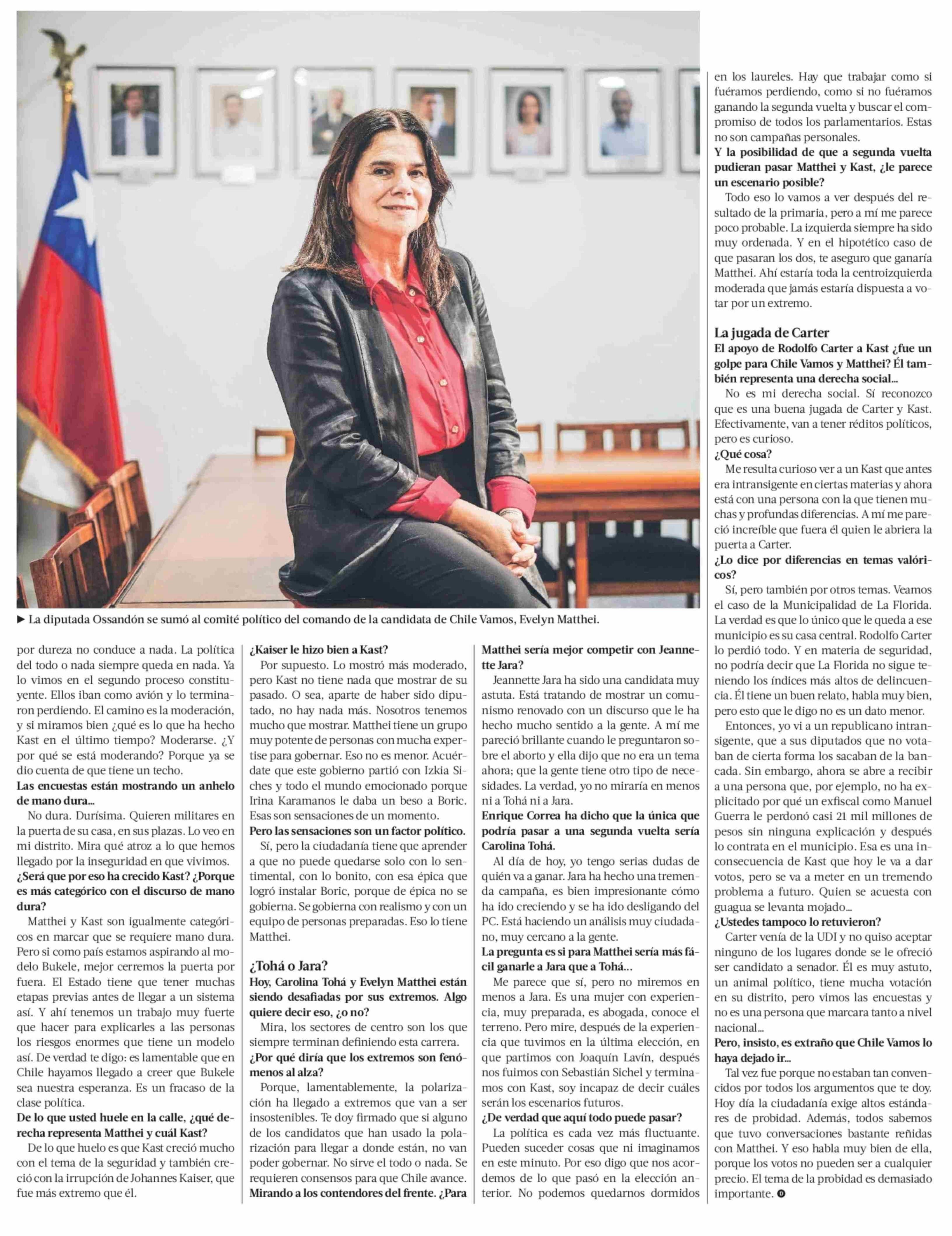 Título: Ximena Ossandón: “Con el nivel de rechazo que tiene José Antonio Kast es imposible que gane en la segunda vuelta”