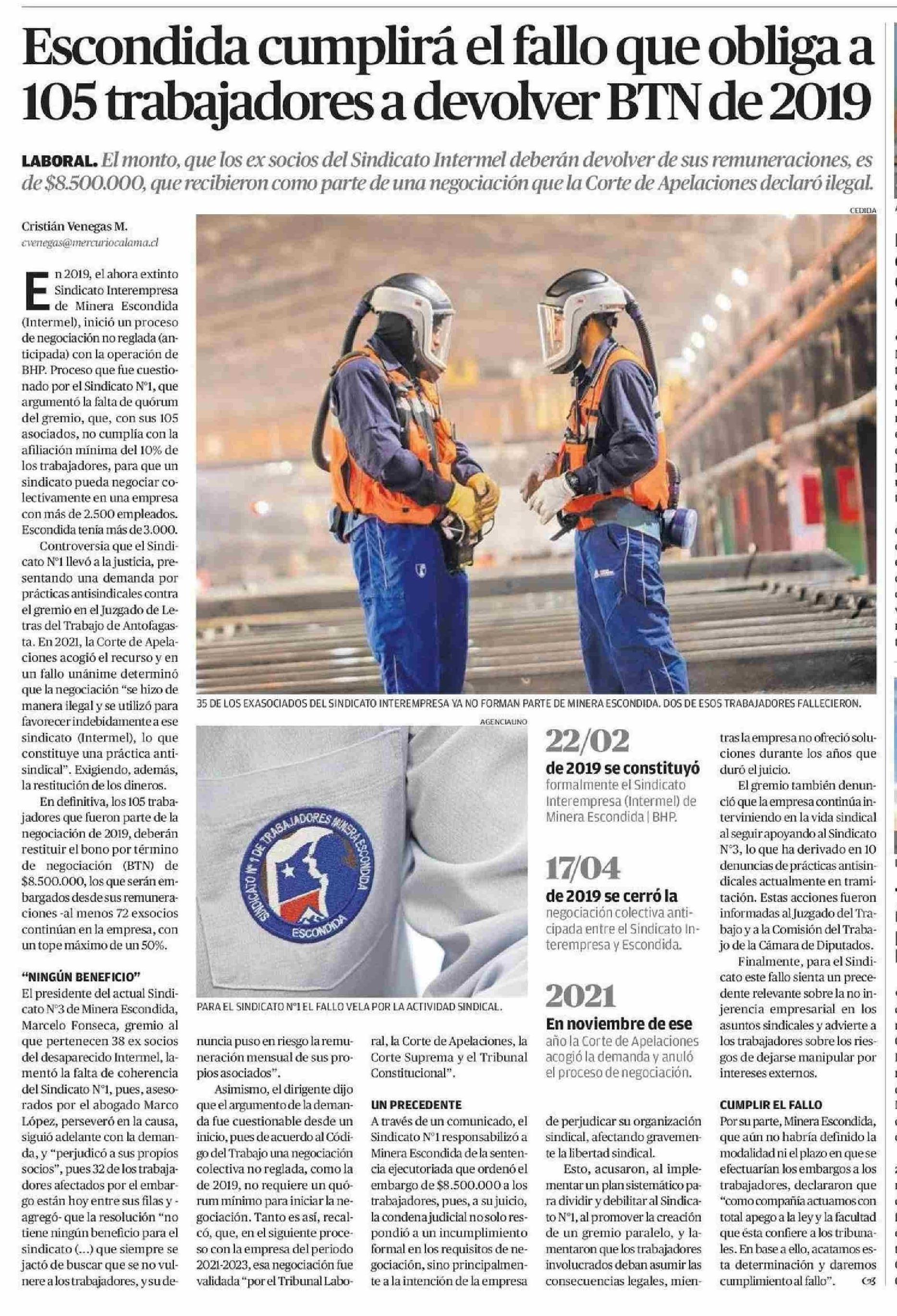 Escondida cumplirá el fallo que obliga a 105 trabajadores a devolver BTN de 2019 11-06-2025 El Mercurio de Antofagasta |