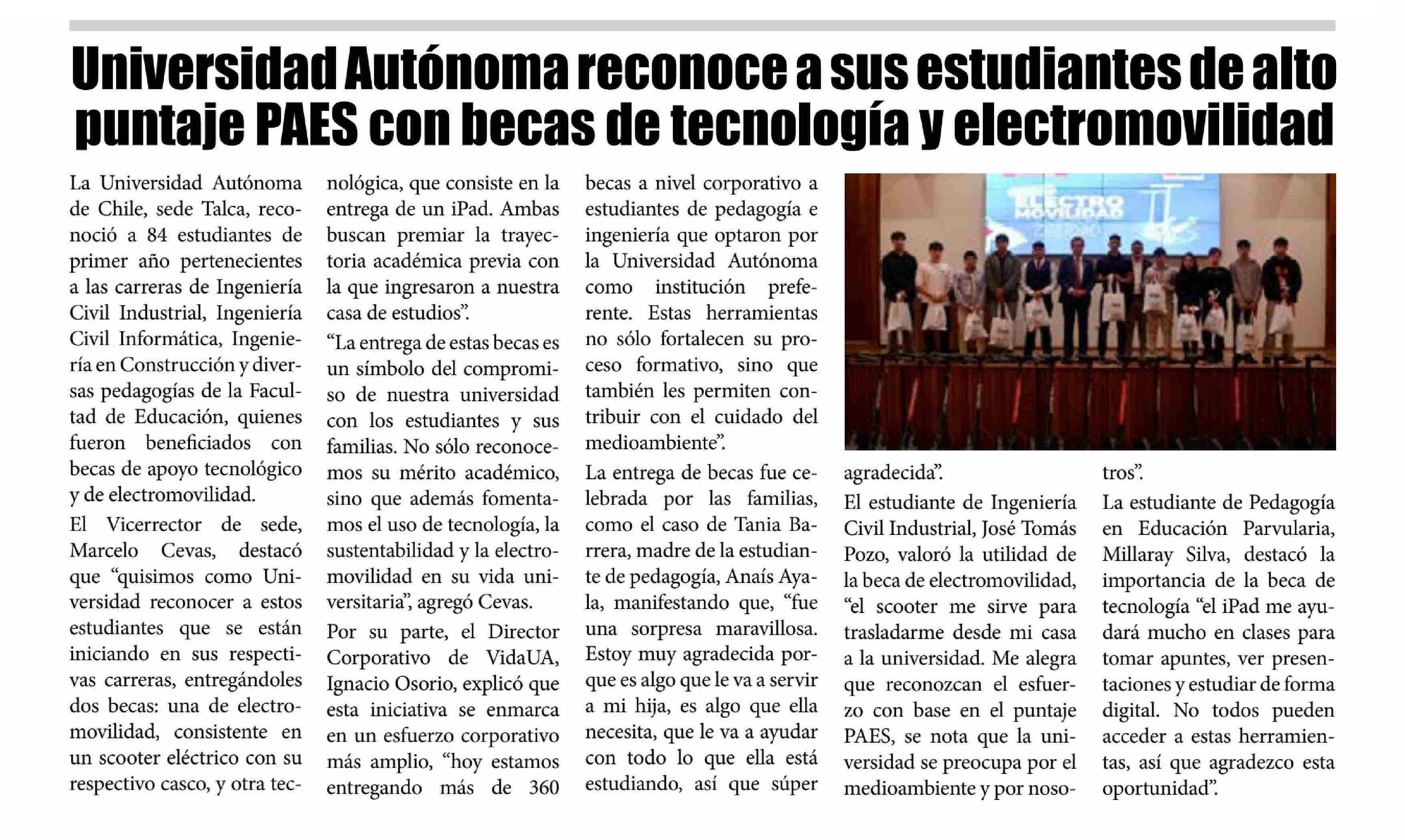 Universidad Autónoma reconoce a sus estudiantes de alto puntaje PAES con becas de tecnología y electgromovilidad 25-04-2025 El Lector |