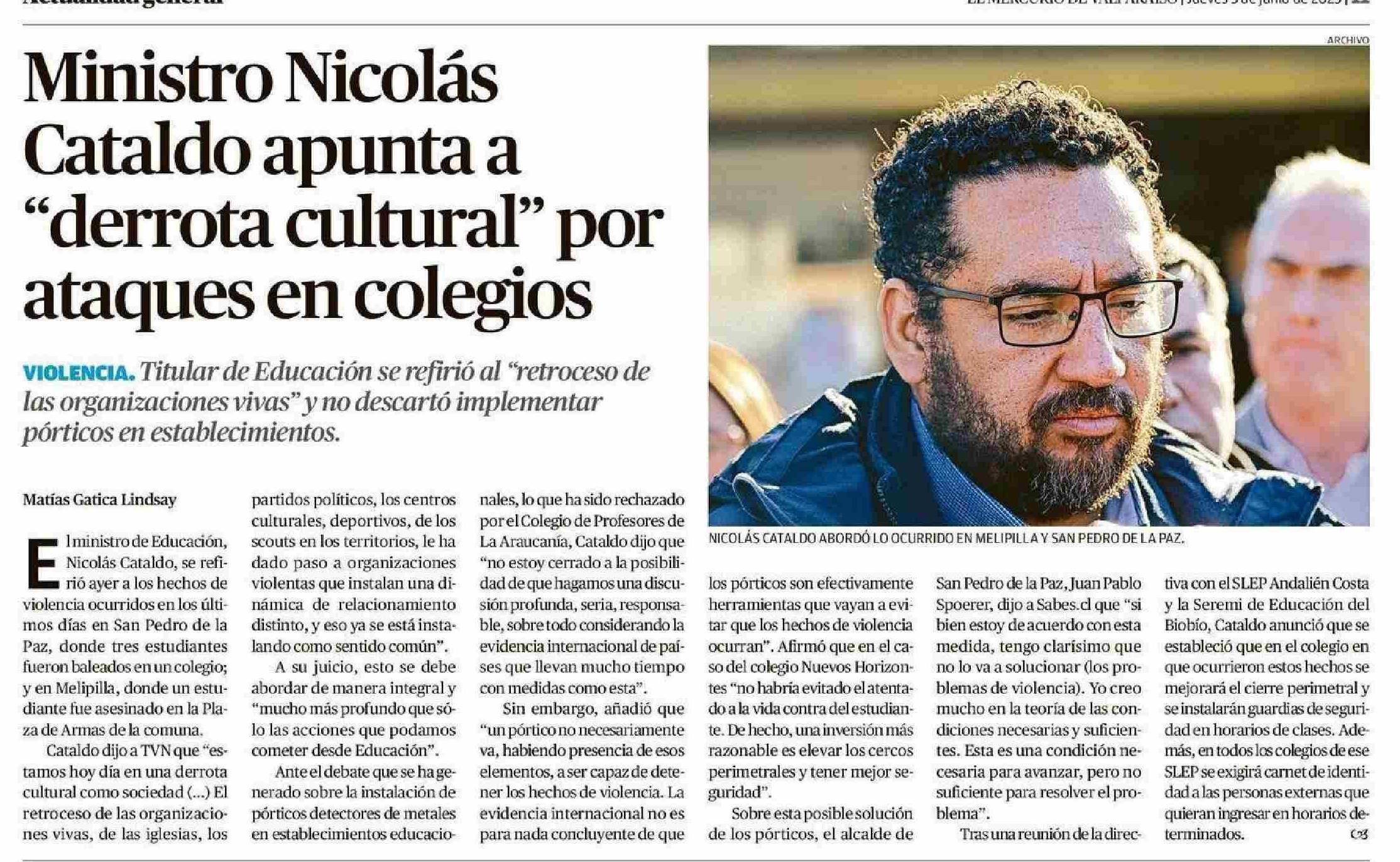 Ministro Nicolás Cataldo apunta a “derrota cultural” por ataques en colegios 05-06-2025 El Mercurio de Valparaíso |