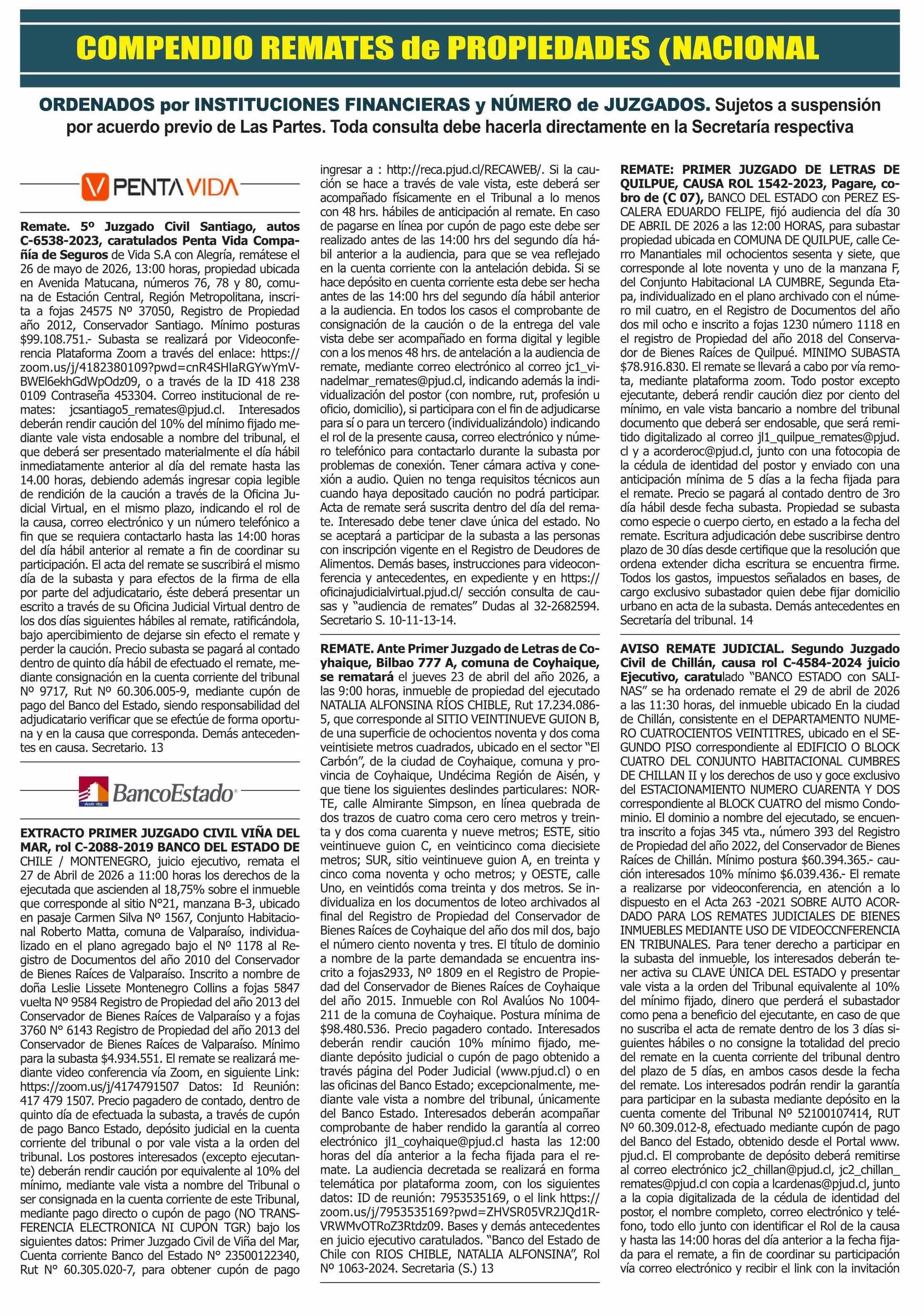 REMATES: COMPENDIO REMATES de PROPIEDADES (NACIONAL 13-04-2026 P&L Públicos y Legales |