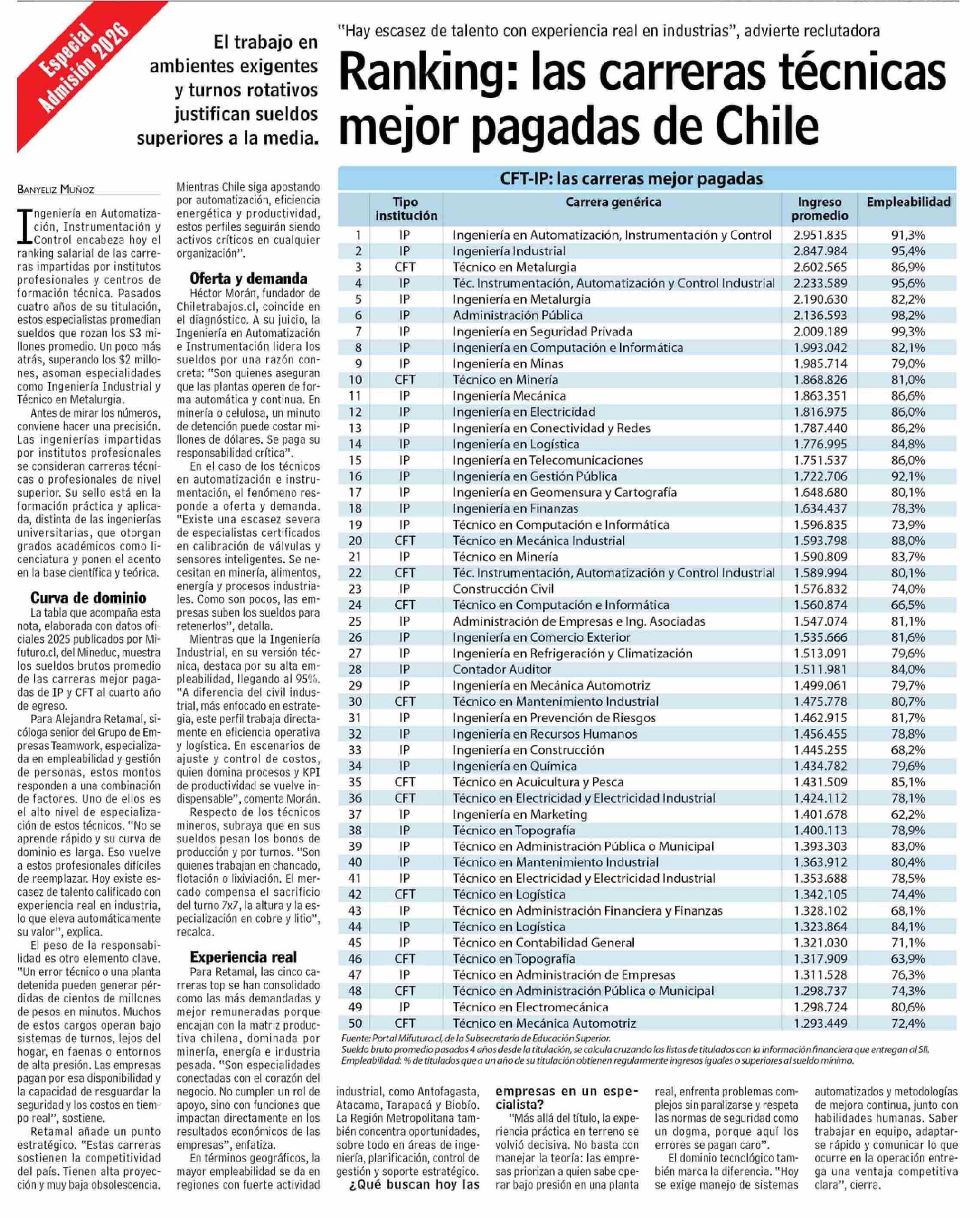 | Título: | Ranking: las carreras técnicas mejor pagadas de Chile |