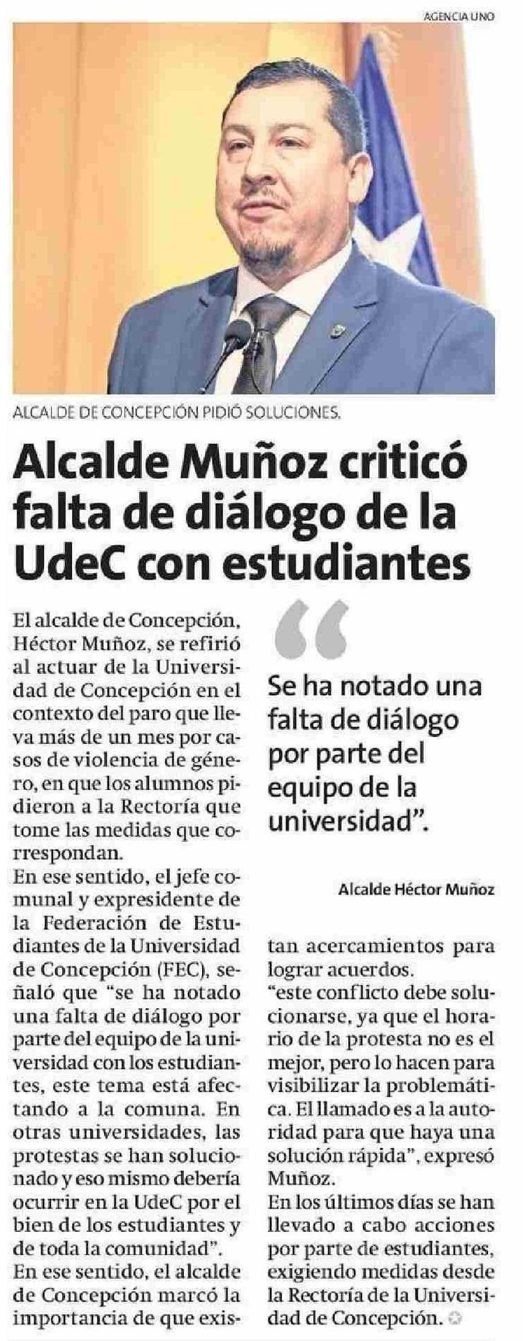 Alcalde Muñoz criticó falta de diálogo de la UdeC con estudiantes 21-05-2025 La Estrella de Concepción |