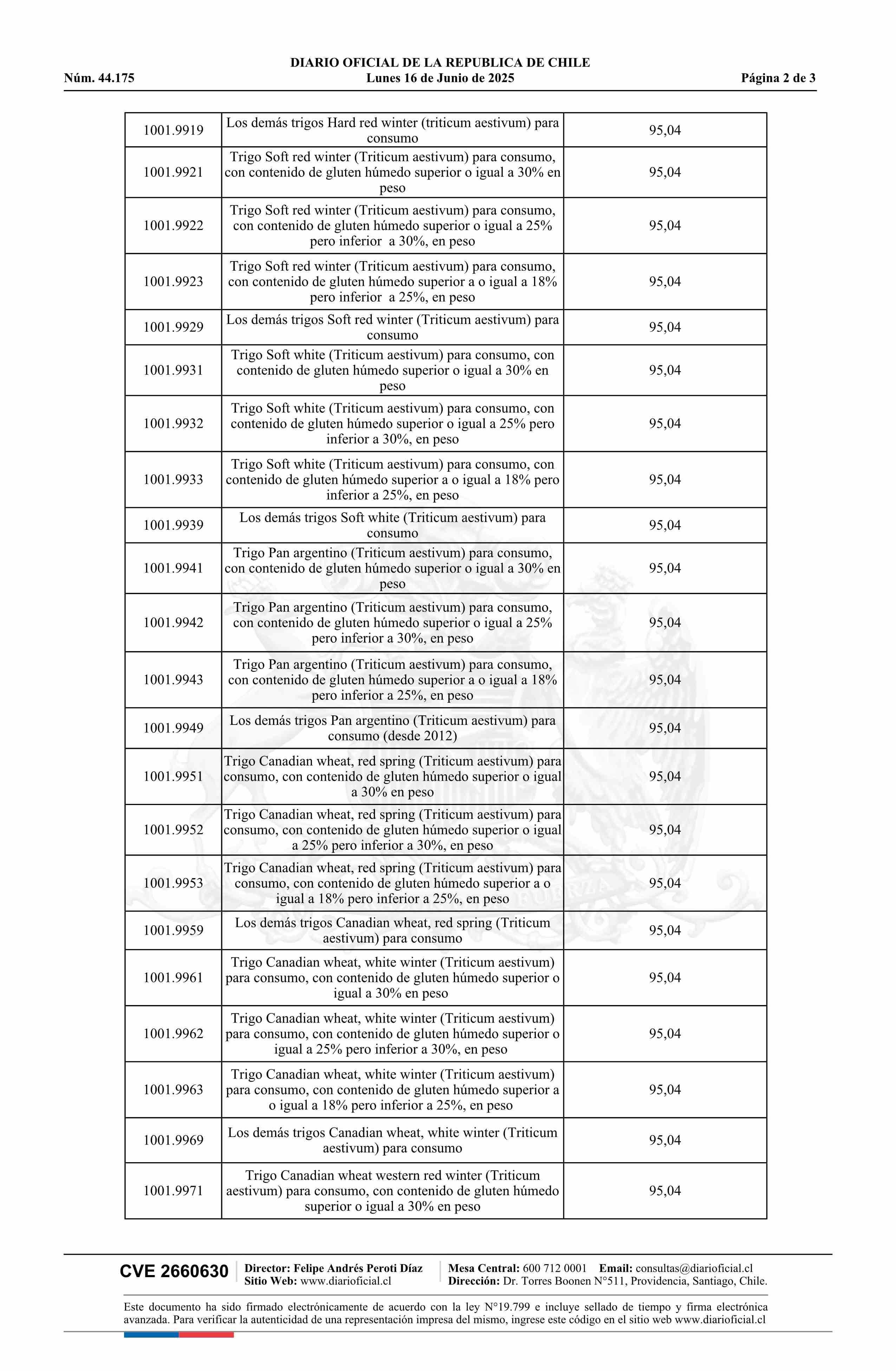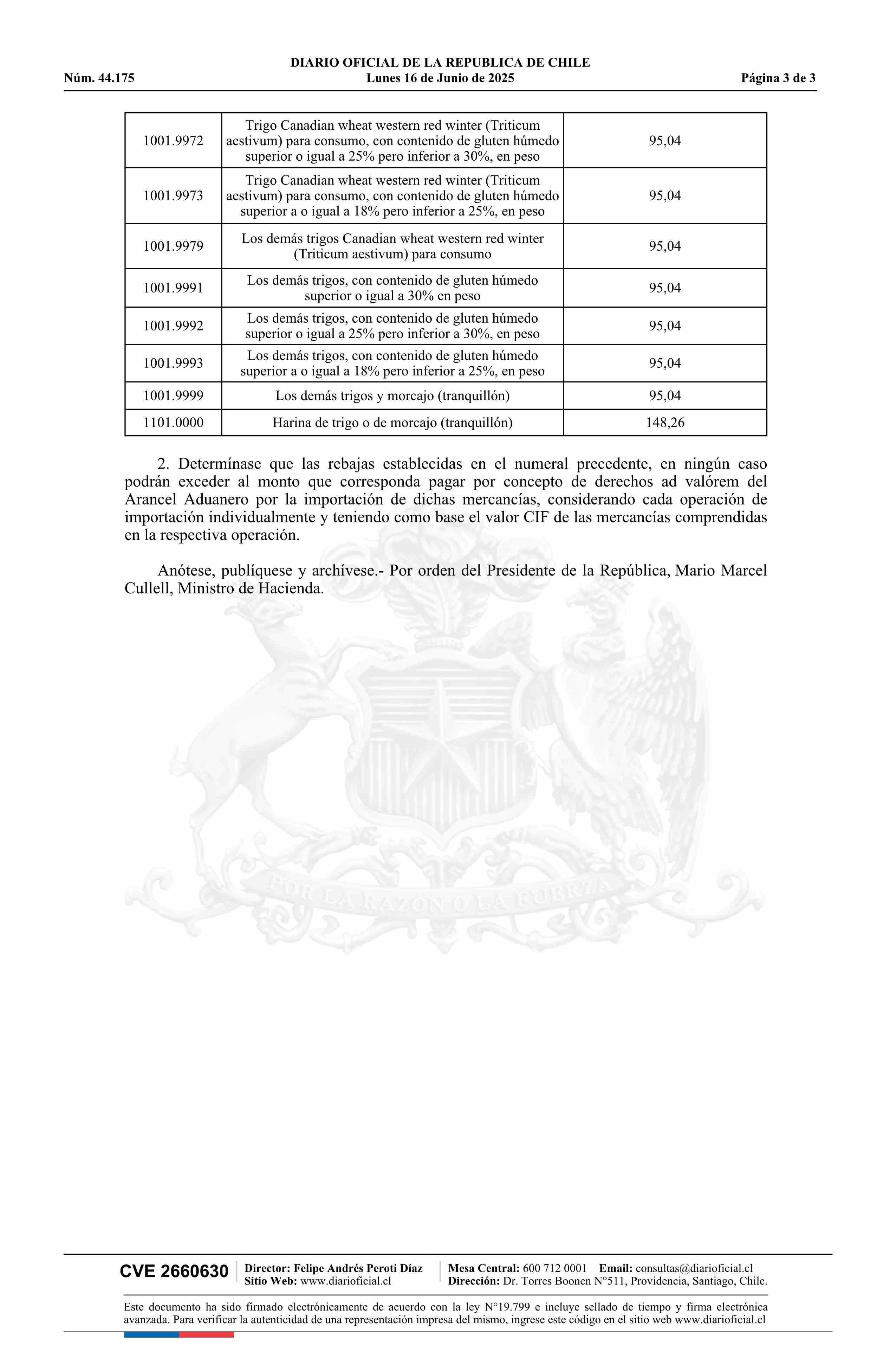 | Título: | Decreto exento número 193, de 2025.- Aplica rebajas de derechos de aduana para la importación de trigo y harina de trigo o de morcajo (tranquillón) |