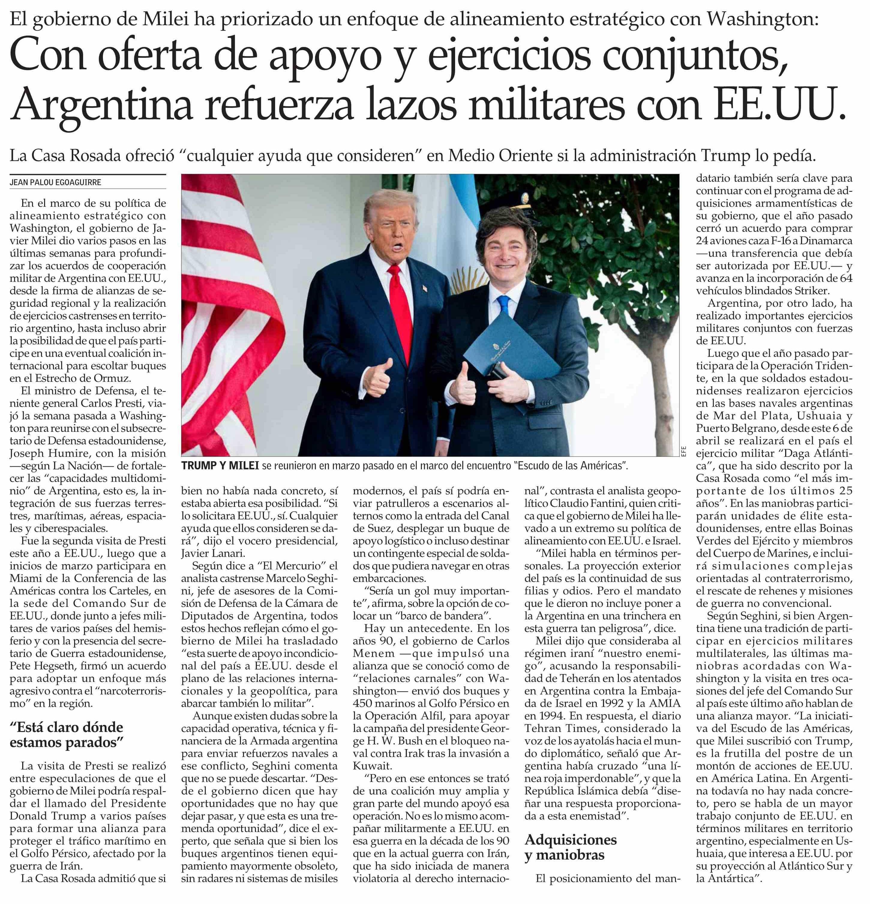 Con oferta de apoyo y ejercicios conjuntos, Argentina refuerza lazos militares con EE.UU. 30-03-2026 El Mercurio |