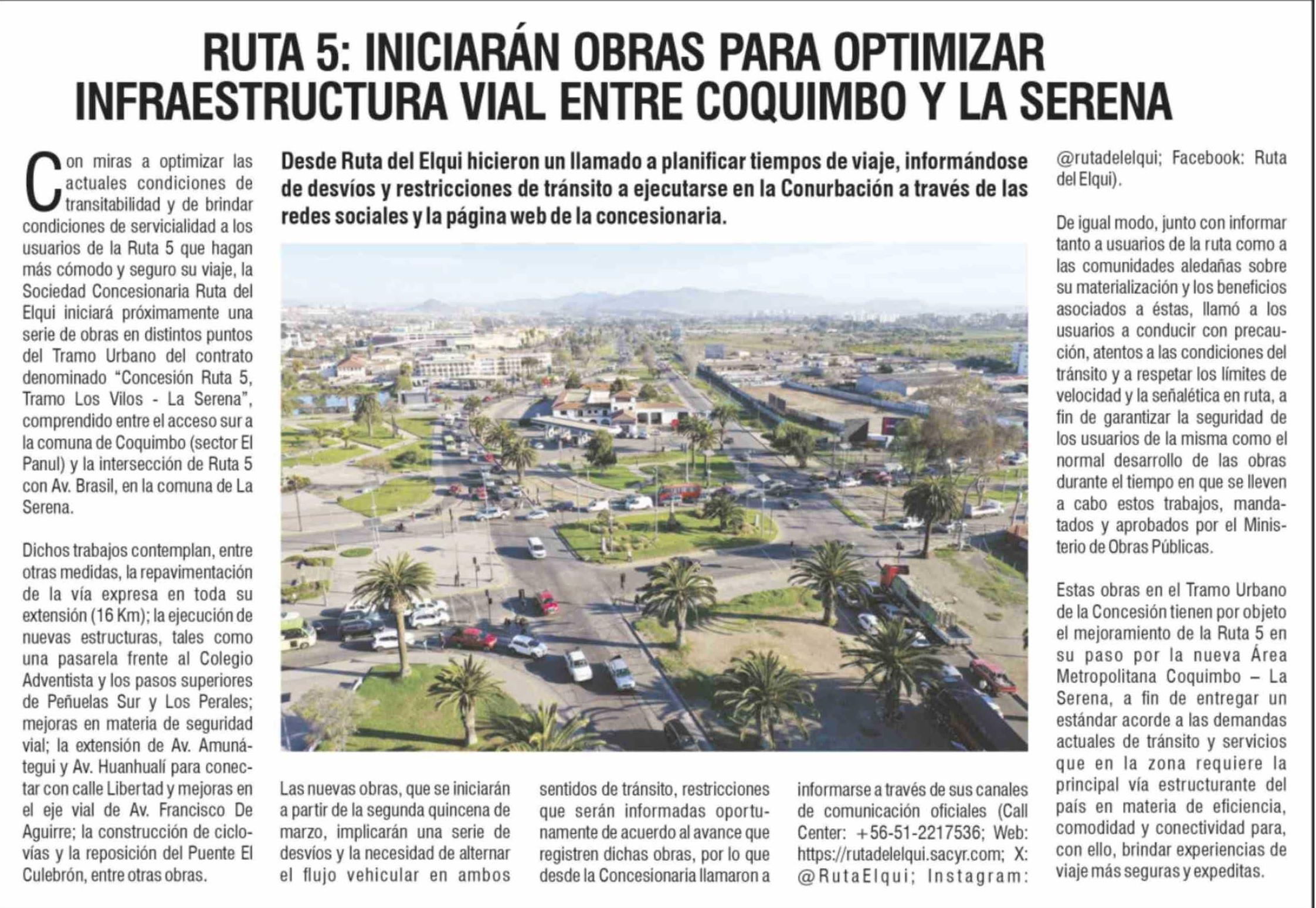 RUTA 5: INICIARÁN OBRAS PARA OPTIMIZAR INFRAESTRUCTURA VIAL ENTRE COQUIMBO Y LA SERENA 11-03-2026 Diario la Región |