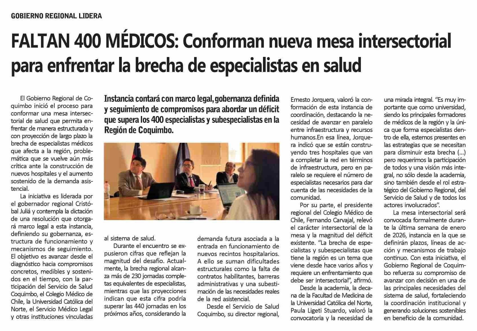 | Título: | FALTAN 400 MÉDICOS: Conforman nueva mesa intersectorial para enfrentar la brecha de especialistas en salud |