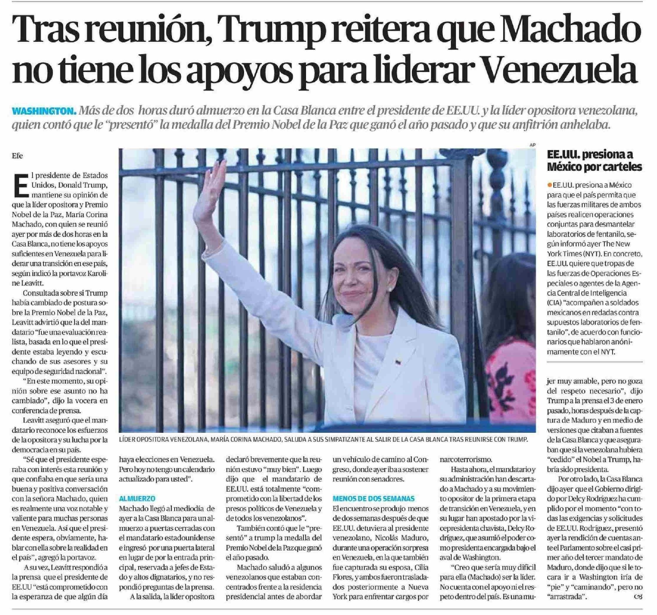 Tras reunión, Trump reitera que Machado no tiene los apoyos para liderar Venezuela 16-01-2026 El Mercurio de Calama |