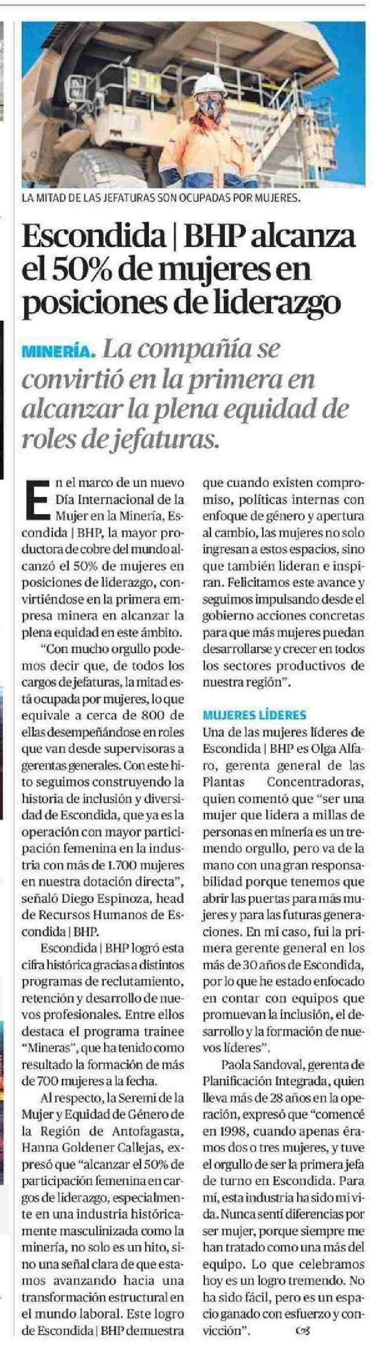 Escondida | BHP alcanza el 50% de mujeres en posiciones de liderazgo 16-06-2025 El Mercurio de Antofagasta |
