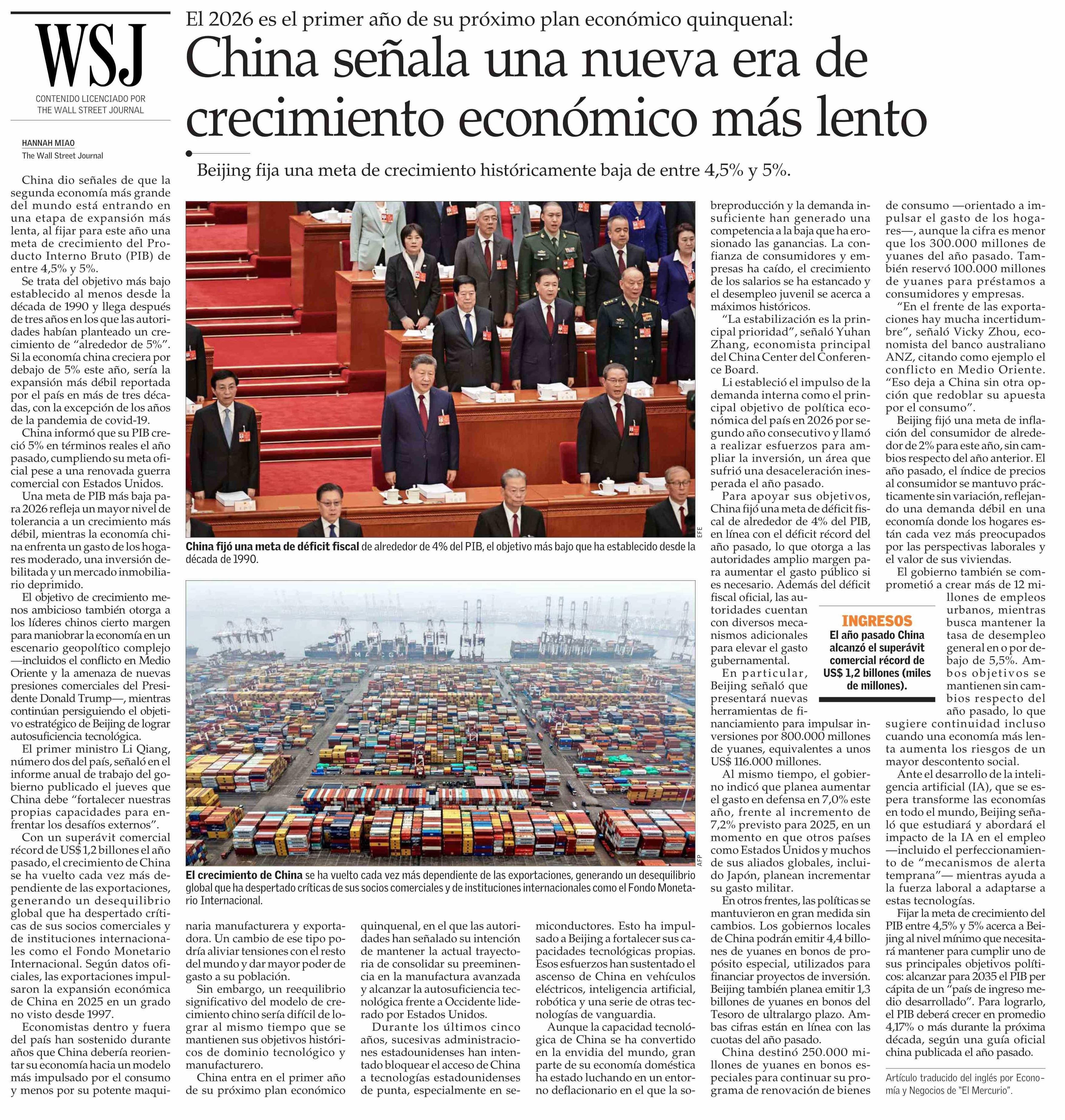China señala una nueva era de crecimiento económico más lento 06-03-2026 El Mercurio |