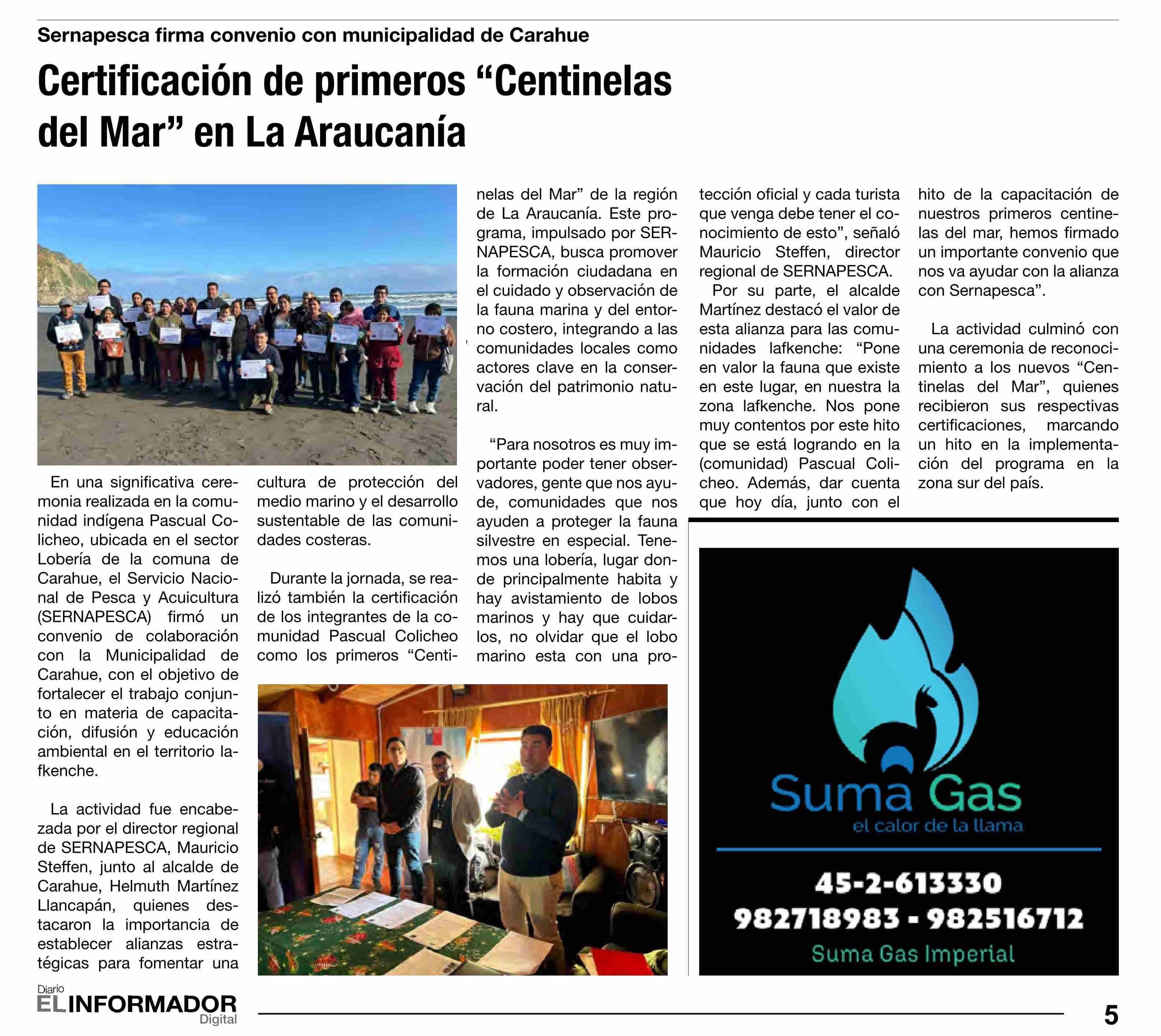 Certificación de primeros “Centinelas del Mar” en La Araucanía 29-05-2025 El Informador |