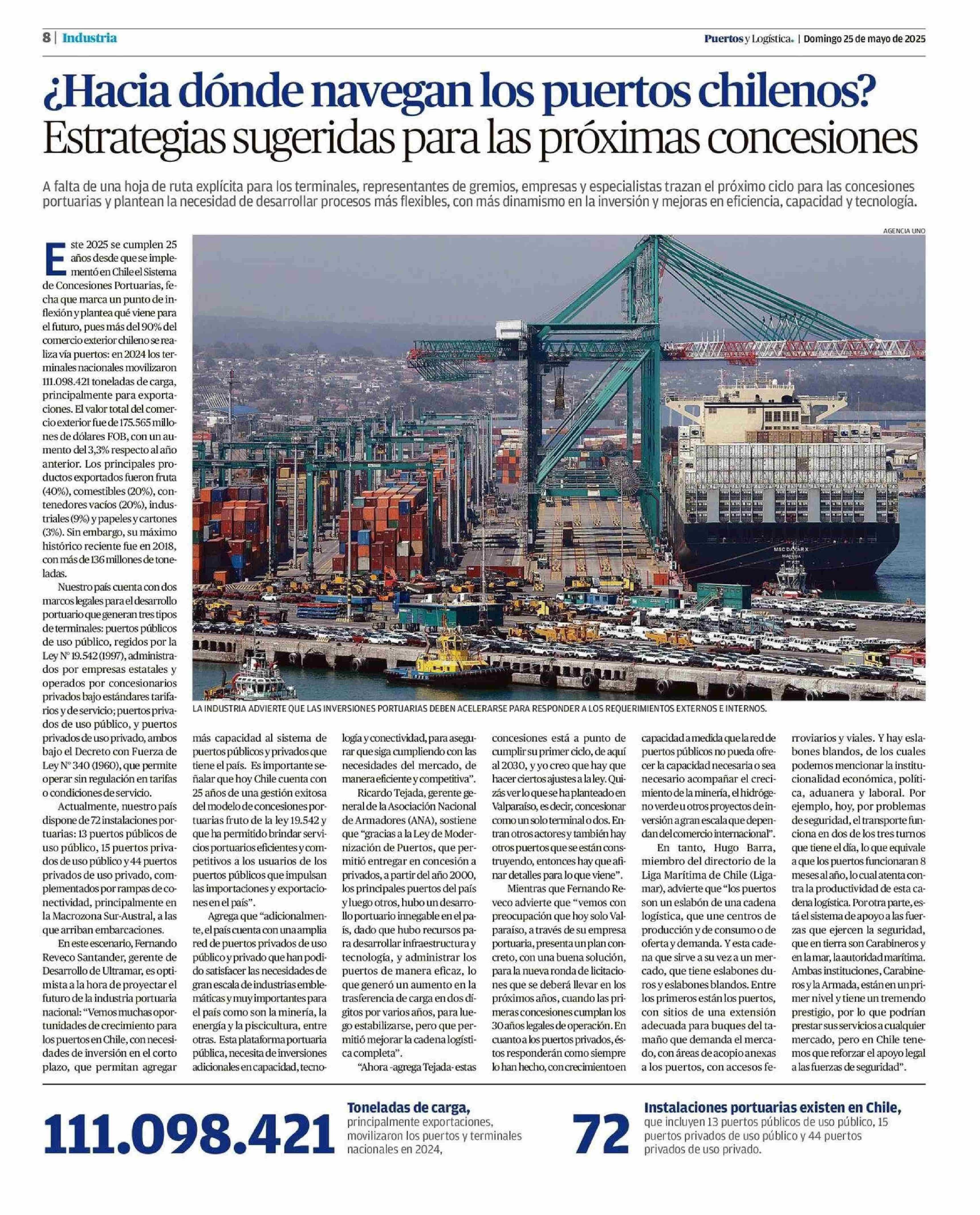 ¿Hacia dónde navegan los puertos chilenos? Estrategias sugendas para las proximas concesiones 25-05-2025 El Mercurio de Valparaíso |