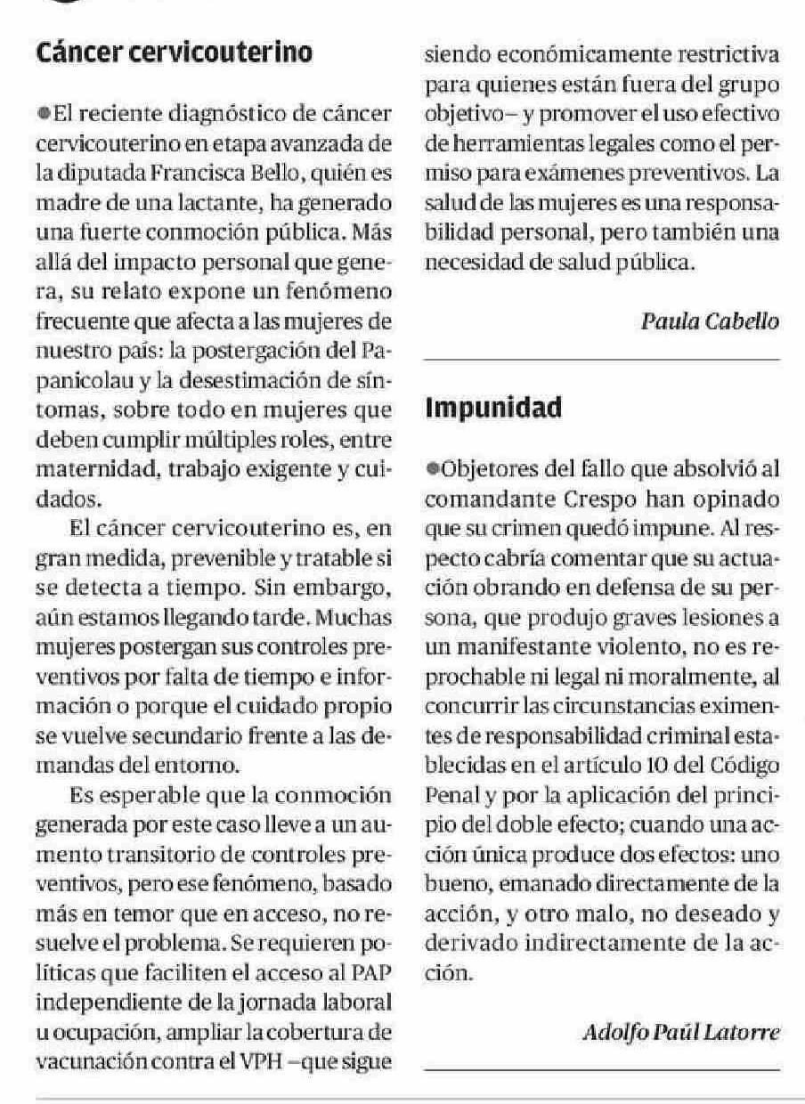 Cartas: Cáncer cervicouterino 19-01-2026 El Mercurio de Calama |