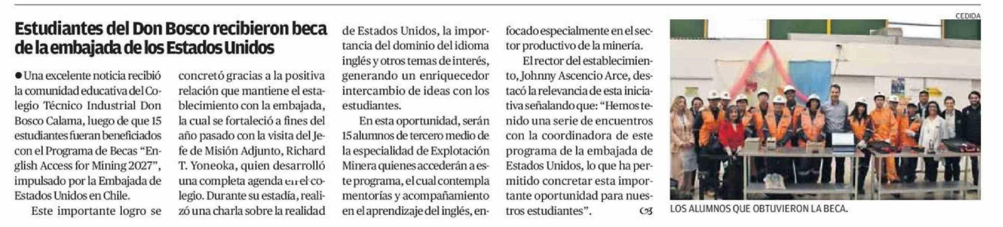 Estudiantes del Don Bosco recibieron beca de la embajada de los Estados Unidos 22-04-2026 El Mercurio de Calama |