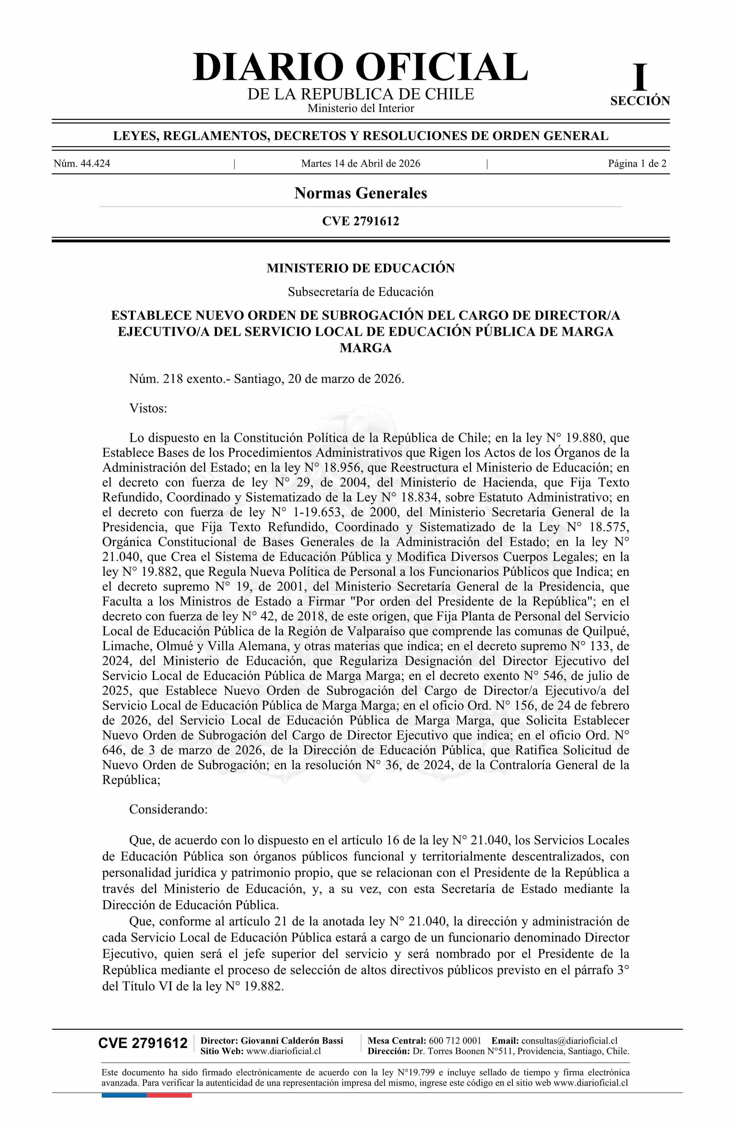 Decreto exento número 218, de 2026.- Establece nuevo orden de subrogación del cargo de Director/a Ejecutivo/a del Servicio Local de Educación Pública de Marga Marga 14-04-2026 Diario Oficial Edición Electrónica |