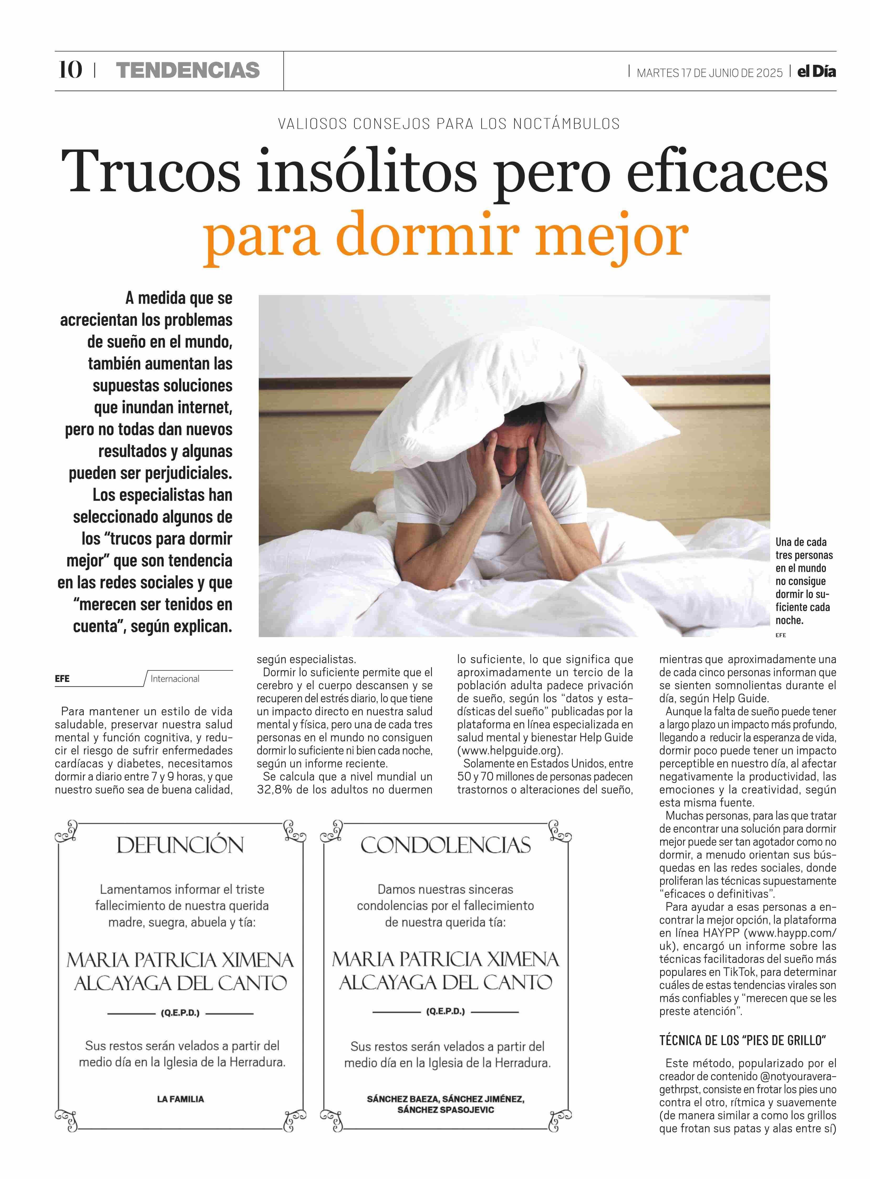 Trucos insólitos pero eficaces para dormir mejor 17-06-2025 El Día |