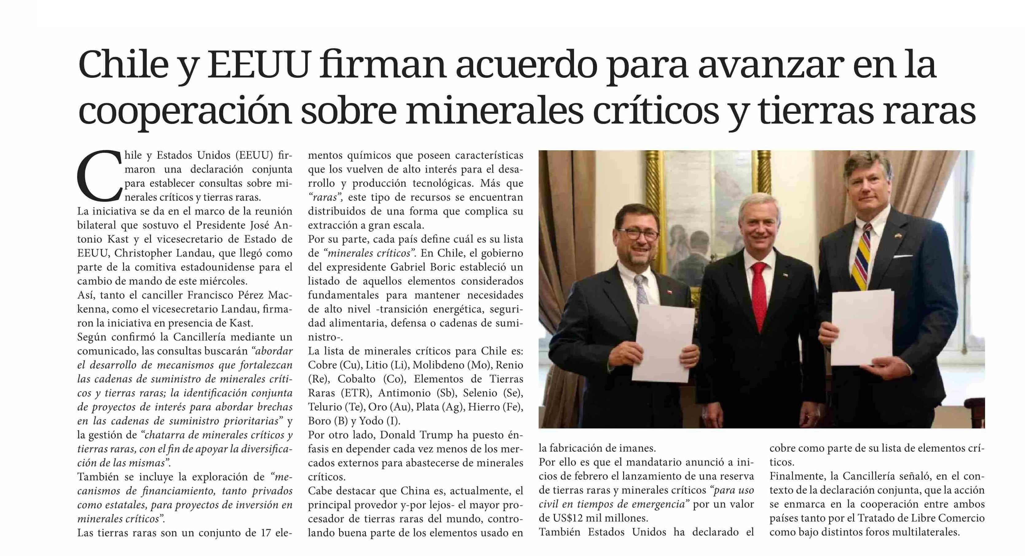 Chile y EEUU firman acuerdo para avanzar en la cooperación sobre minerales críticos y tierras raras 14-03-2026 Diario Chañarcillo |