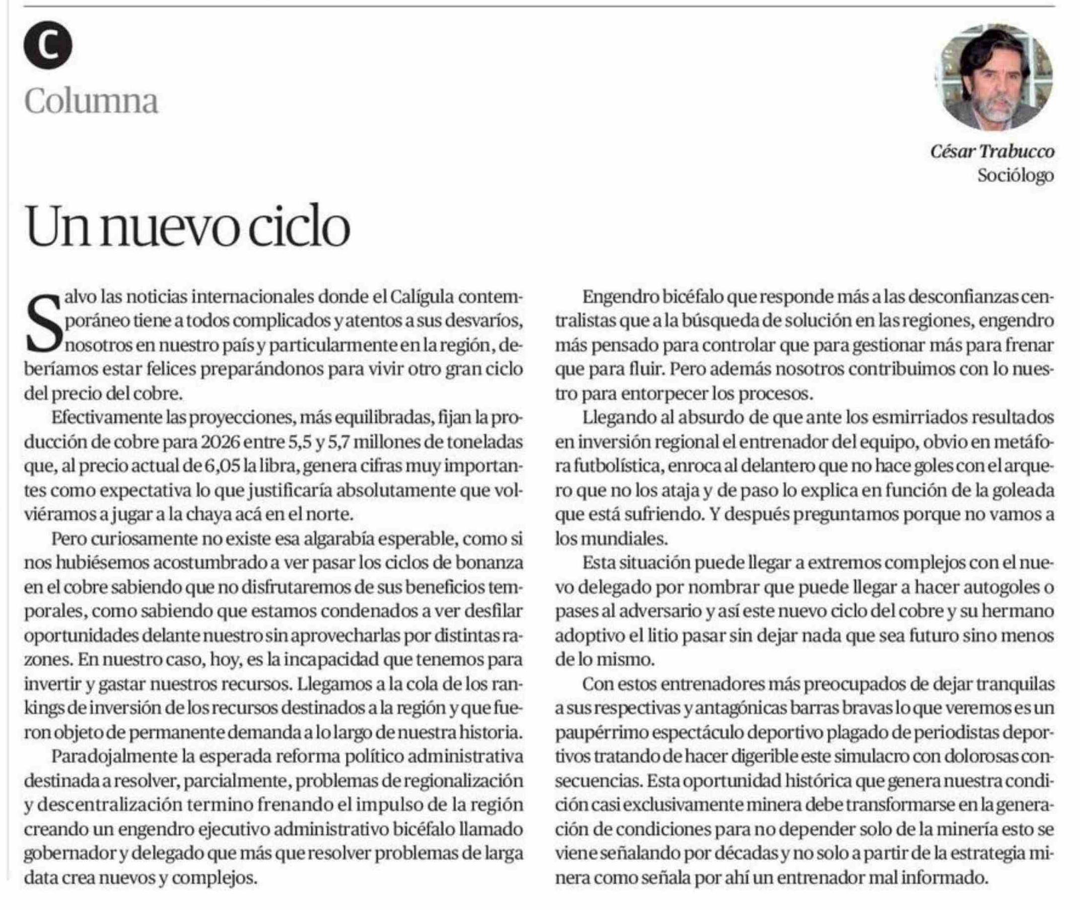 Columnas de Opinión: Un nuevo ciclo 18-01-2026 El Mercurio de Antofagasta |