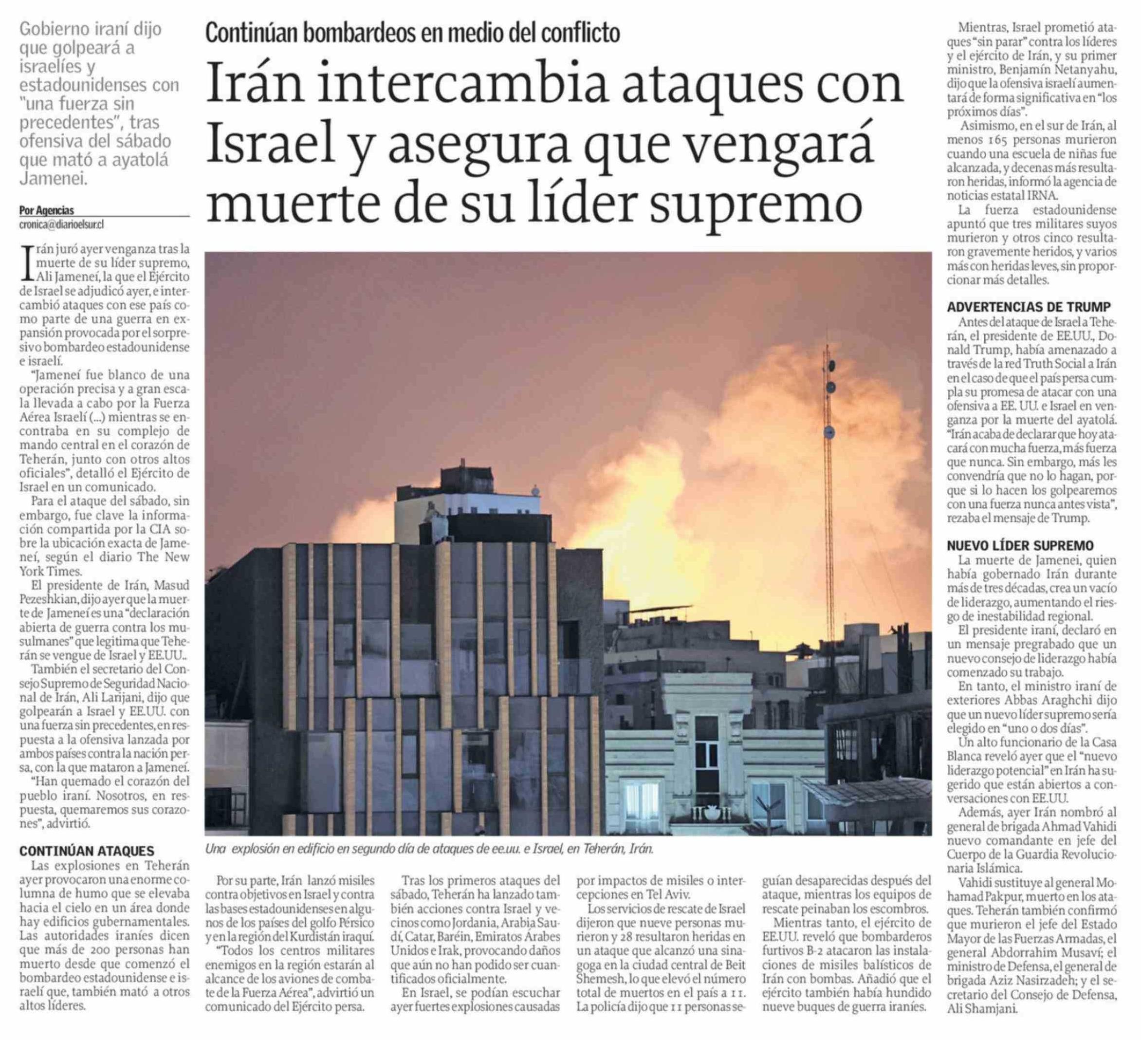 Título: Irán intercambia ataques con Israel y asegura que vengará muerte de su líder supremo