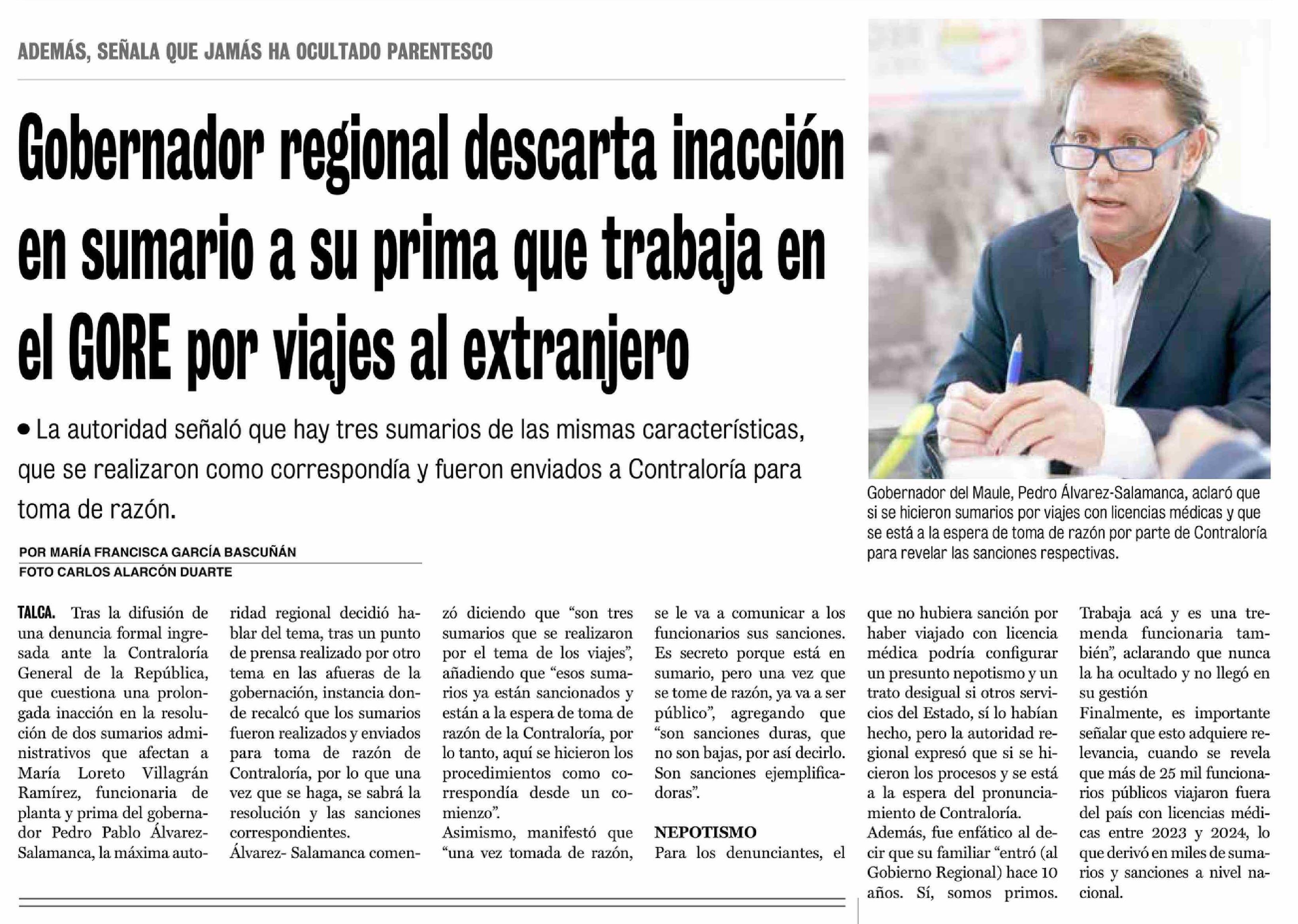 Gobernador regional descarta inacción en sumario a su prima que trabaja en el GORE por viajes al extranjero 18-02-2026 La Prensa de Curicó |