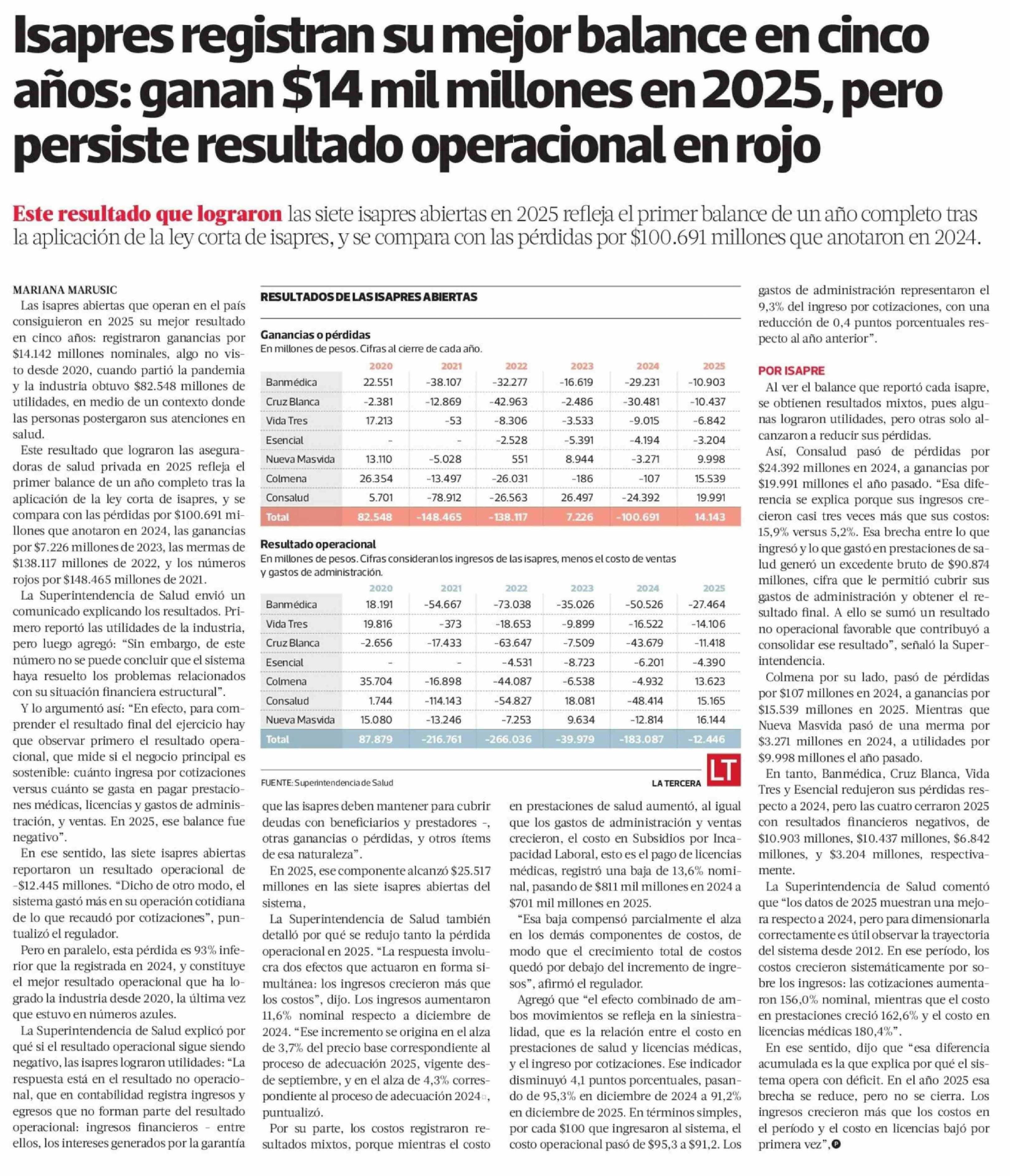 Isapres registran su mejor balance en cinco años: ganan $14 mil millones en 2025, pero persiste resultado operacional en rojo 23-04-2026 La Tercera |