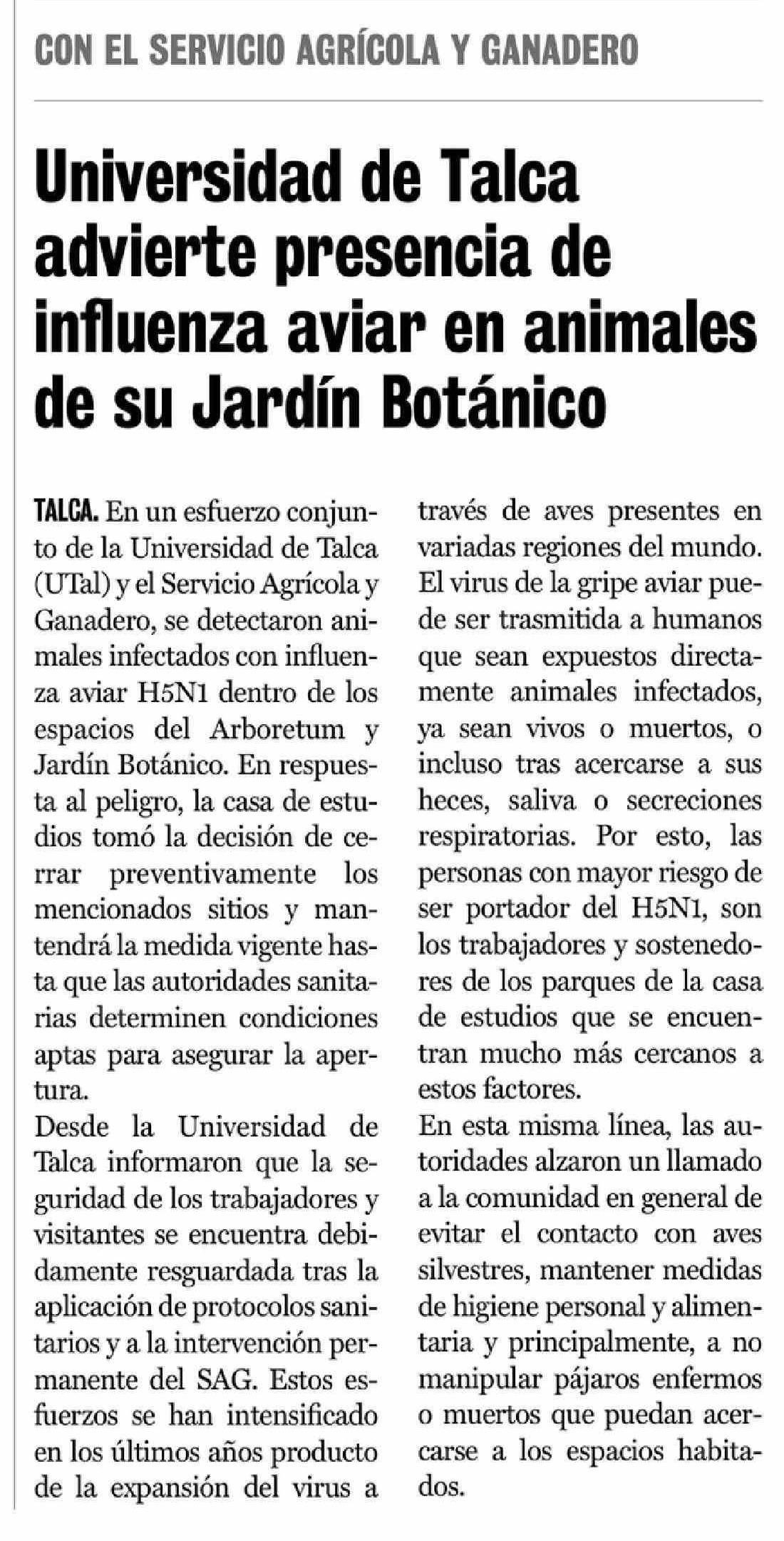 Título: Universidad de Talca advierte presencia de influenza aviar en animales de su Jardín Botánico