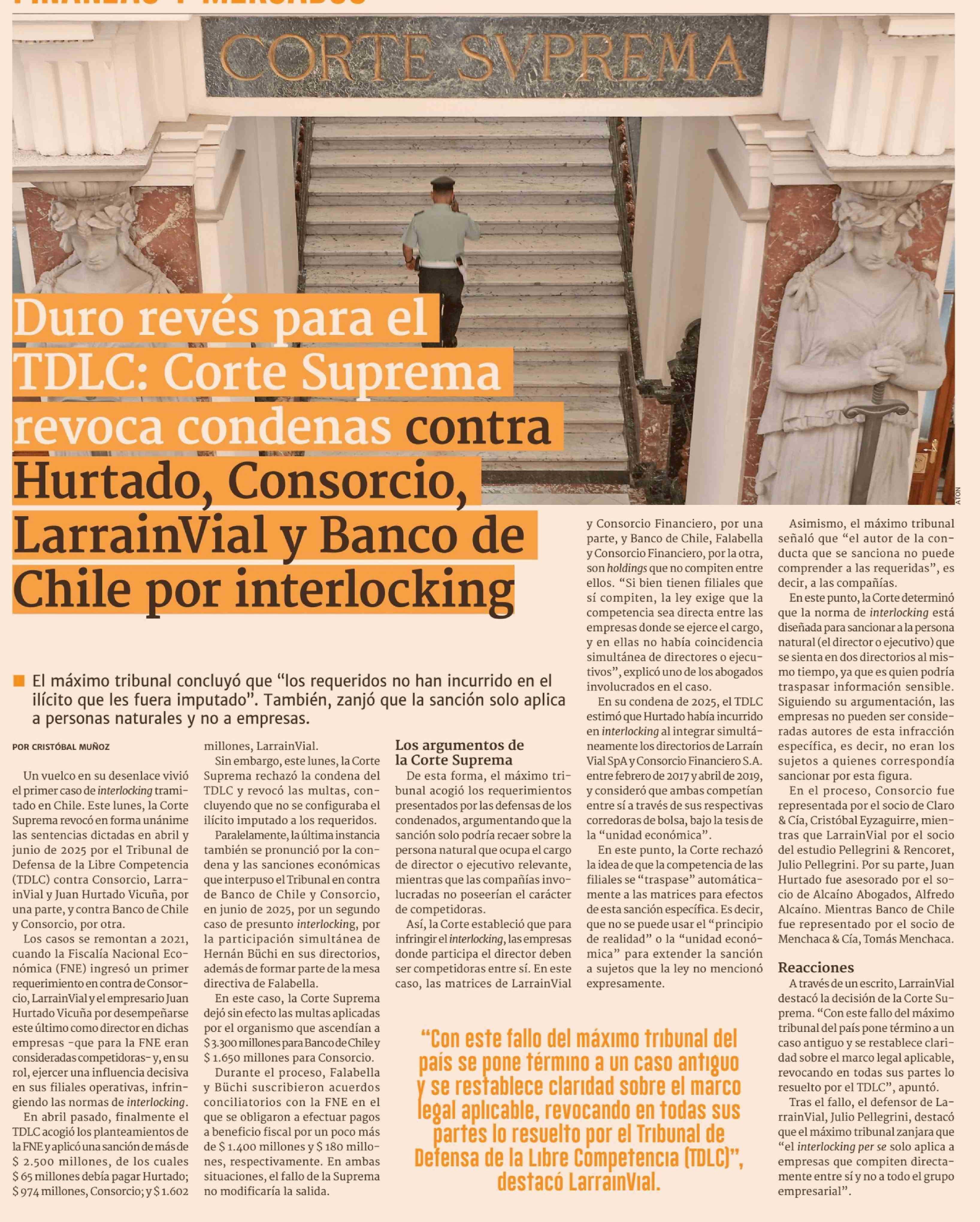 | Título: | Duro revés para el TDLC: Corte Suprema revoca condenas contra Hurtado, Consorcio, LarrainVial y Banco de Chile por interlocking |