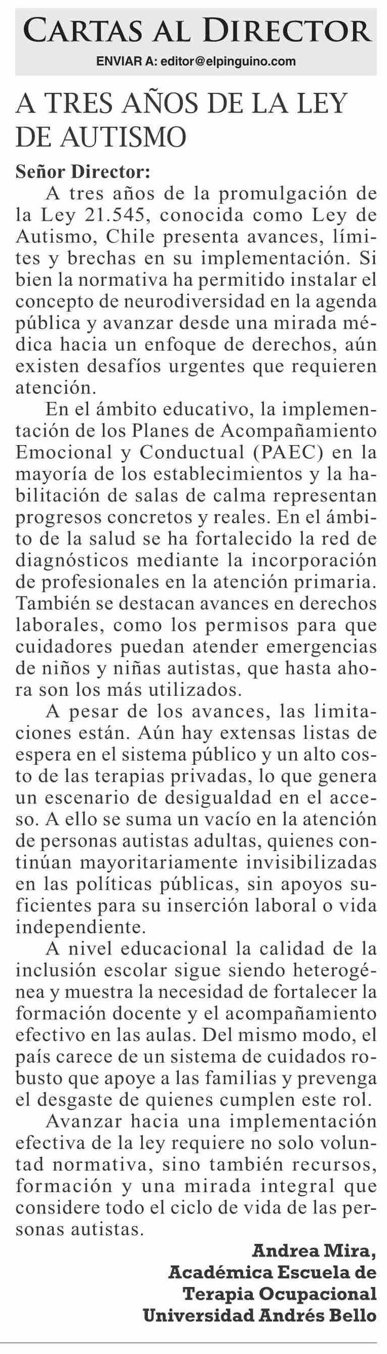 Cartas: A tres Años de lA ley de Autismo 03-04-2026 El Pingüino |