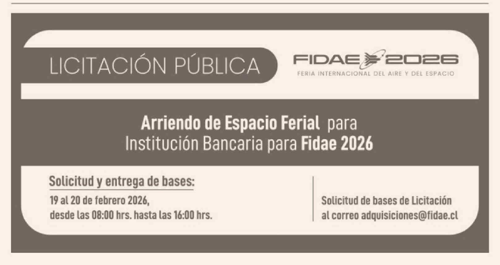 Título: Aviso Licitaciones: INSTITUCIÓN BANCARIA PARA FIDAE