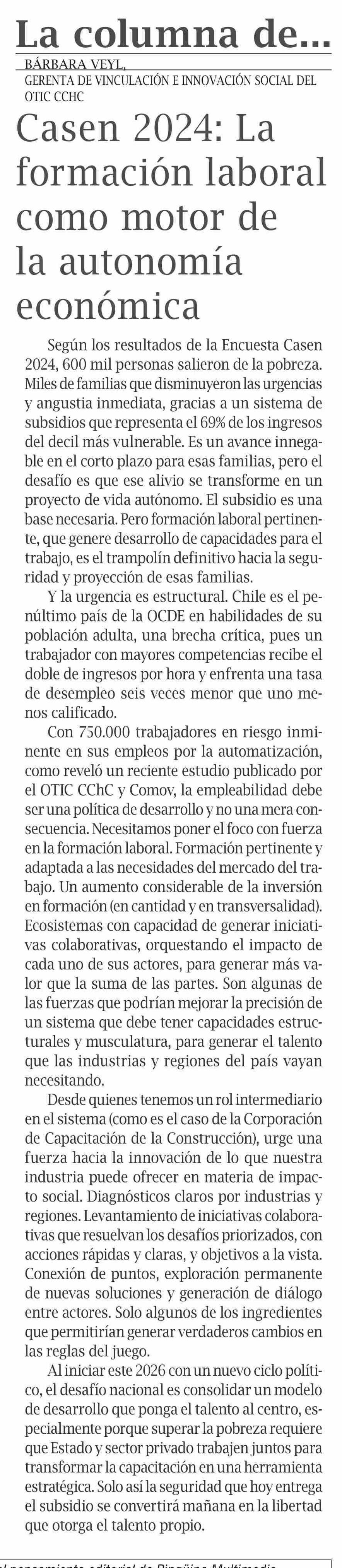 | Título: | Columnas de Opinión: Casen 2024: La formación laboral como motor de la autonomía económica |
