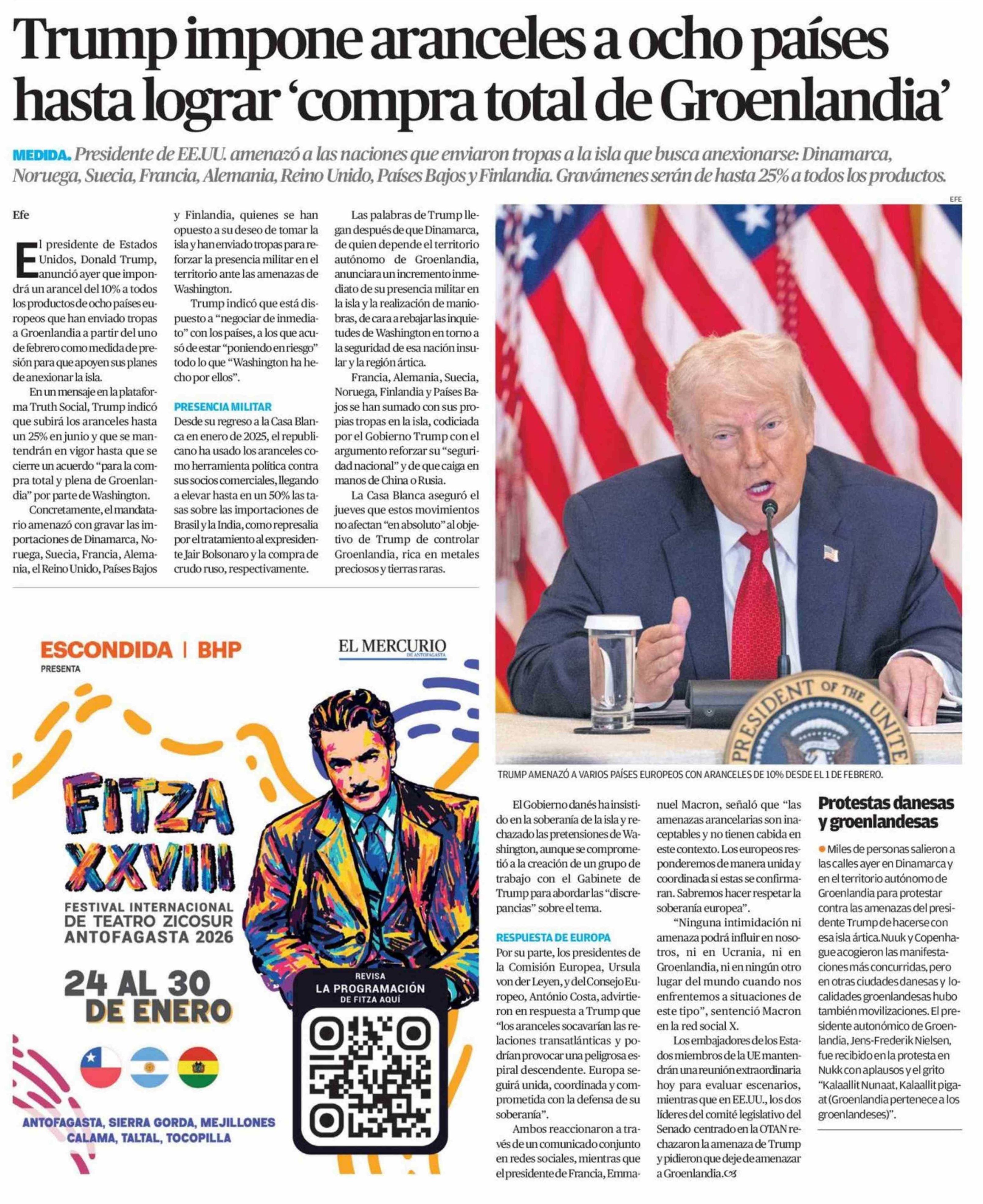 Trump impone aranceles a ocho países hasta lograr 'compra total de Groenlandia' 18-01-2026 El Mercurio de Antofagasta |