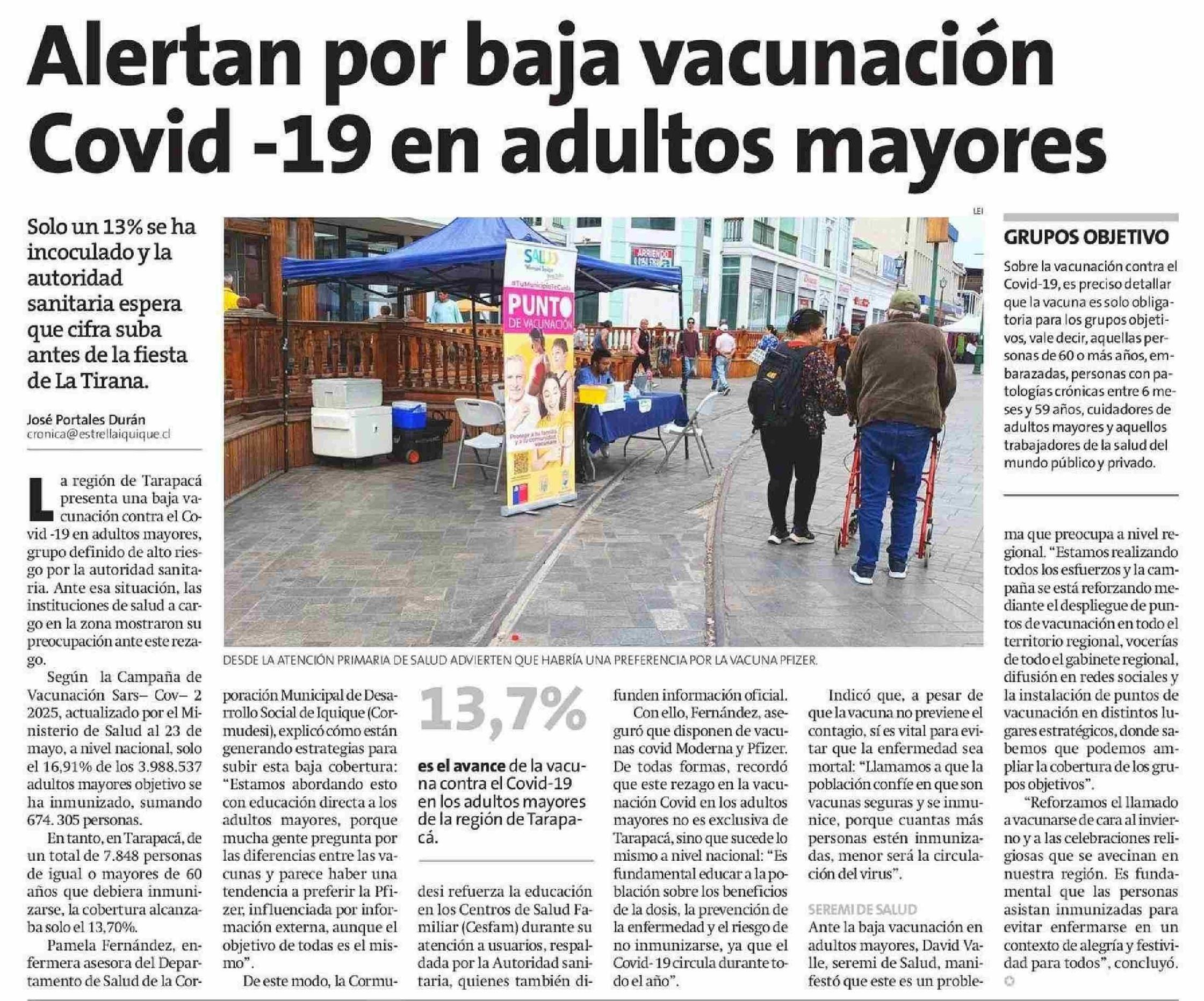 Alertan por baja vacunación Covid -19 en adultos mayores 25-05-2025 La Estrella de Iquique |