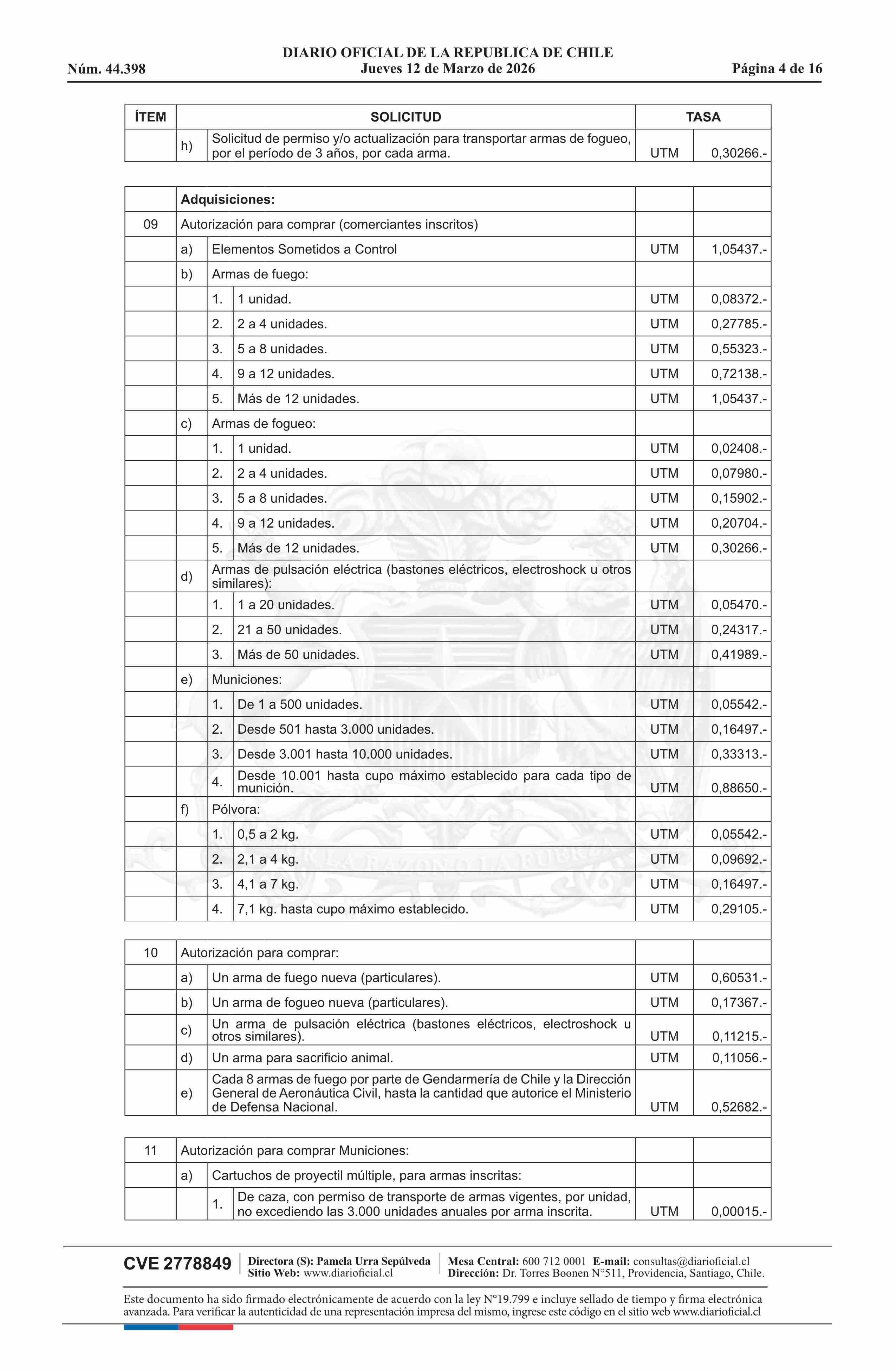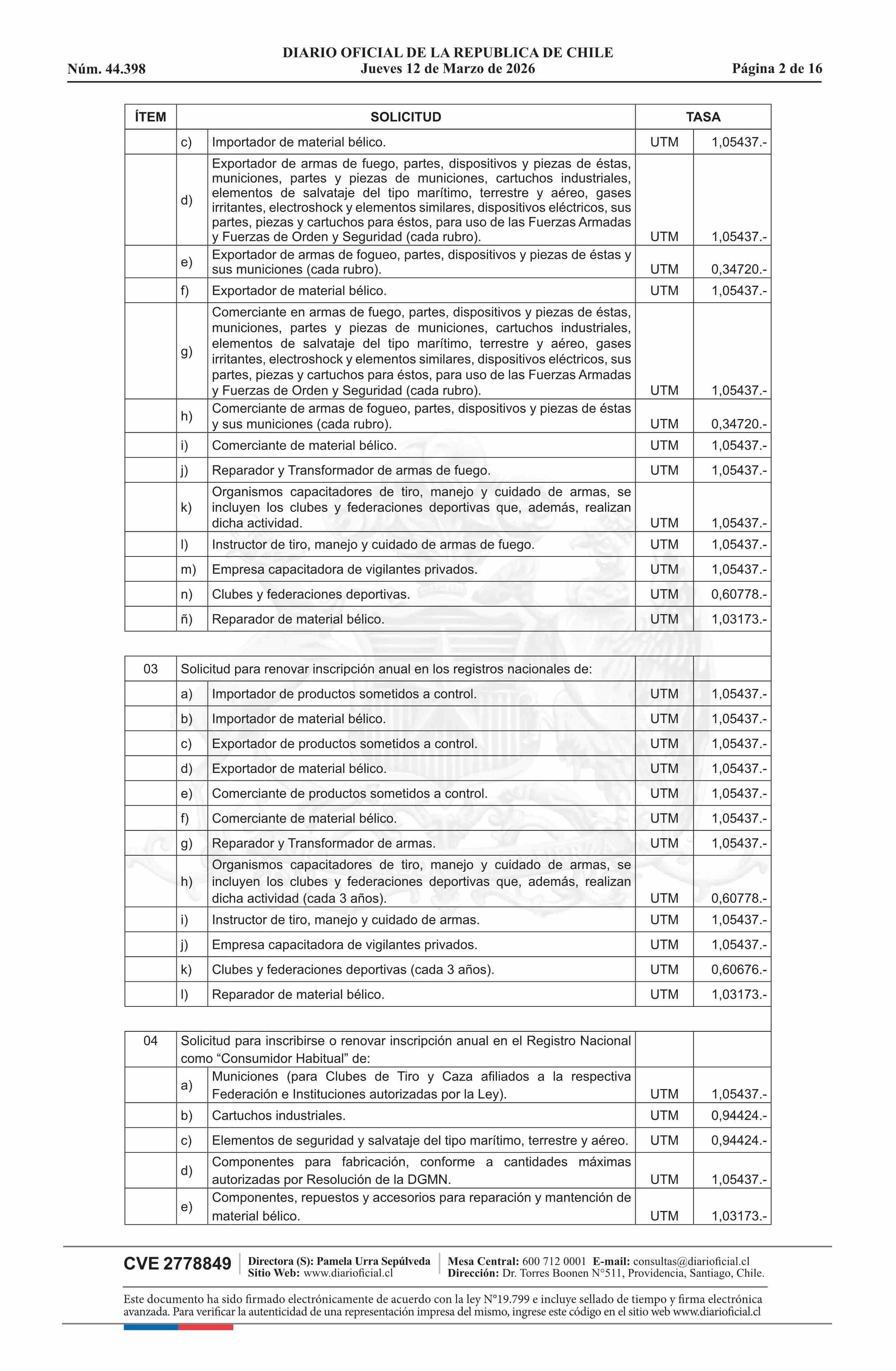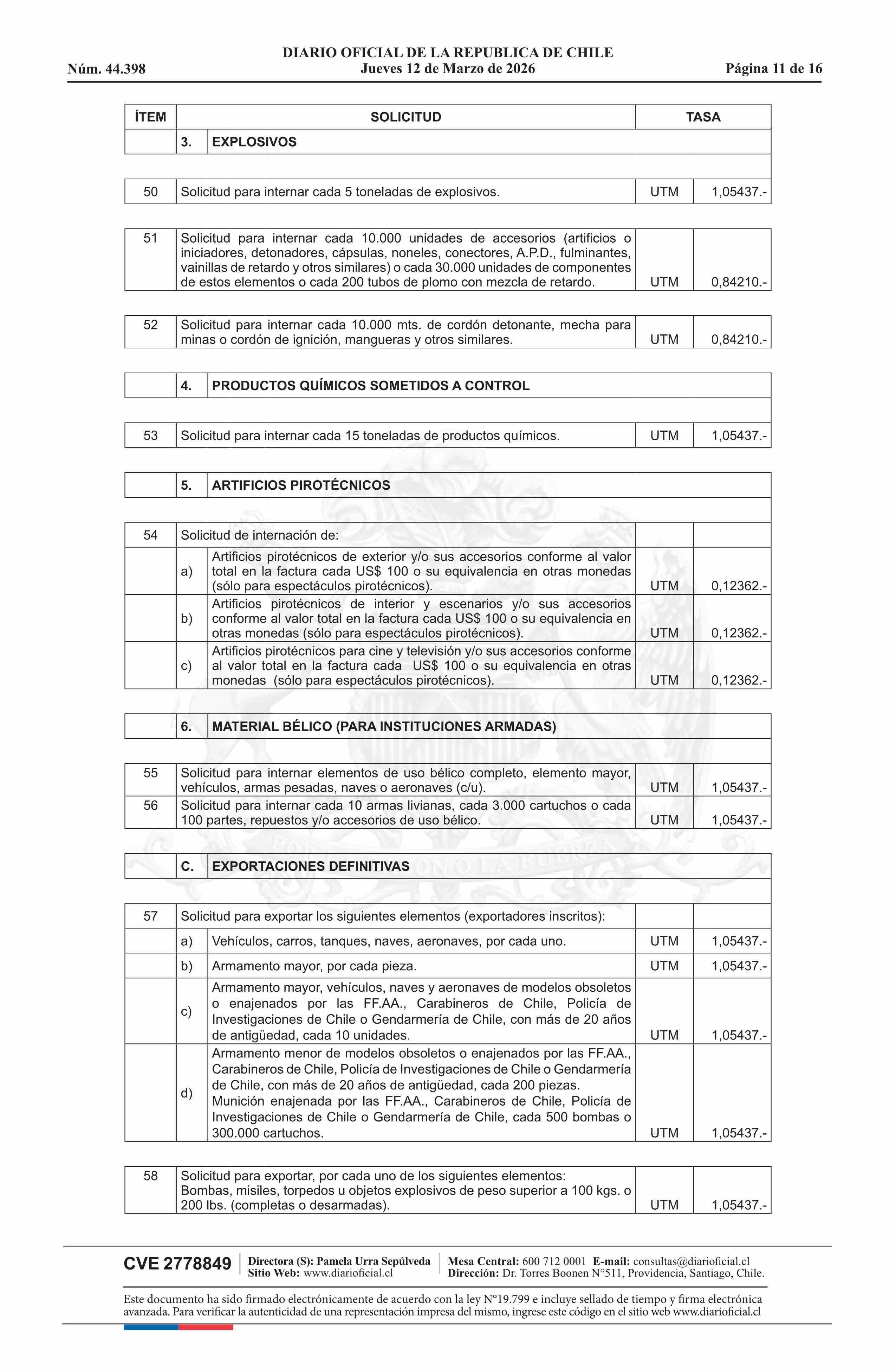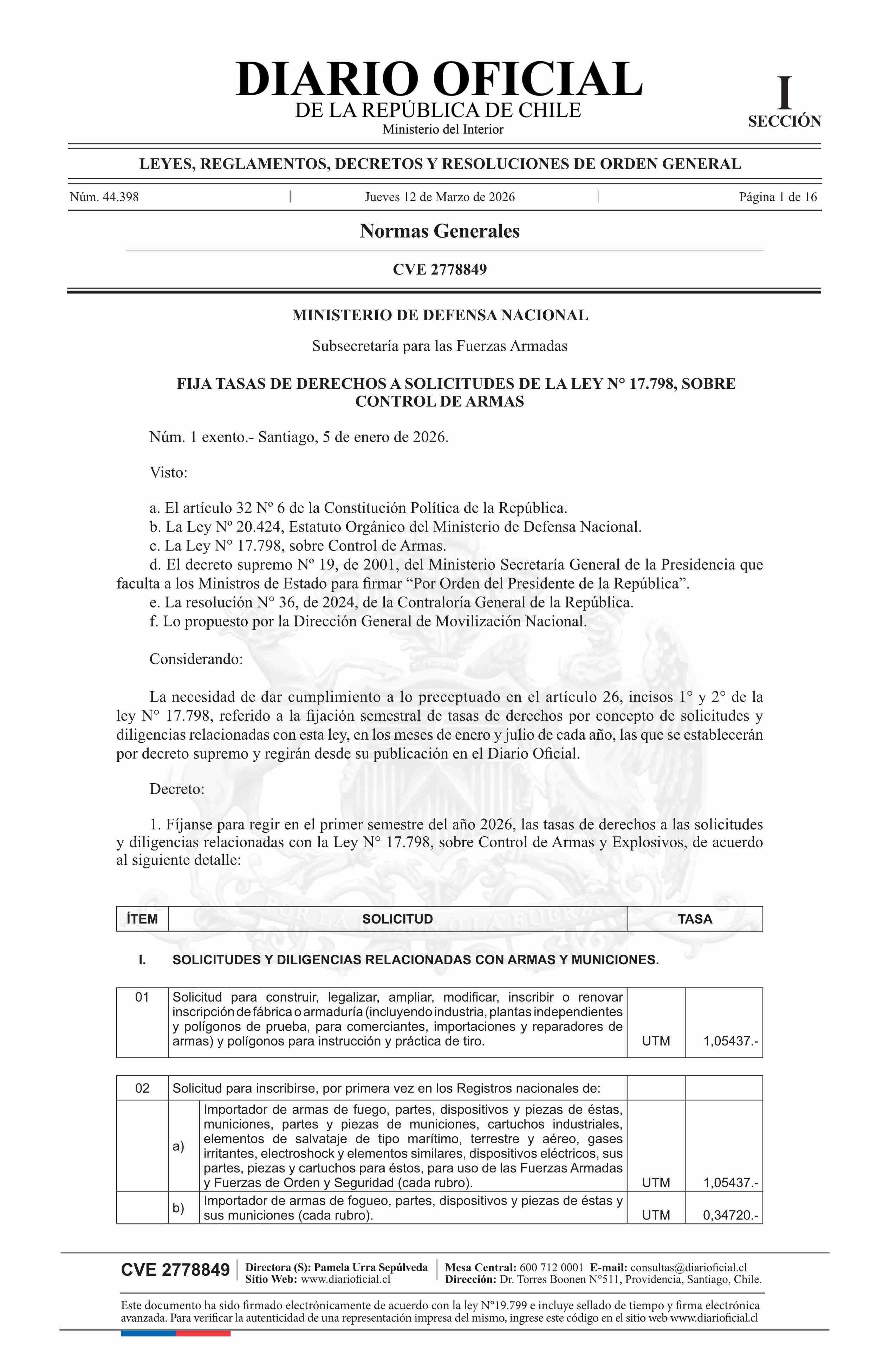 Decreto exento número 1, de 2026.- Fija tasas de derechos a solicitudes de la ley N° 17.798, sobre Control de Armas 12-03-2026 Diario Oficial Edición Electrónica |