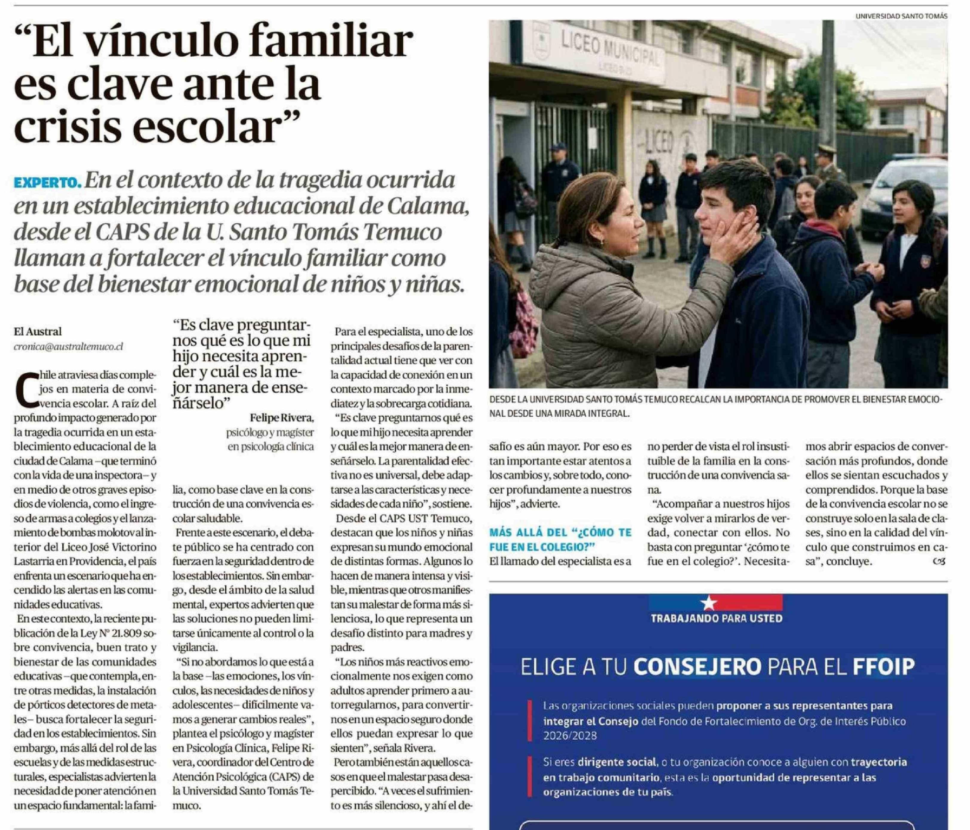 "El vínculo familiar es clave ante la crisis escolar" 21-04-2026 El Austral de la Araucanía |