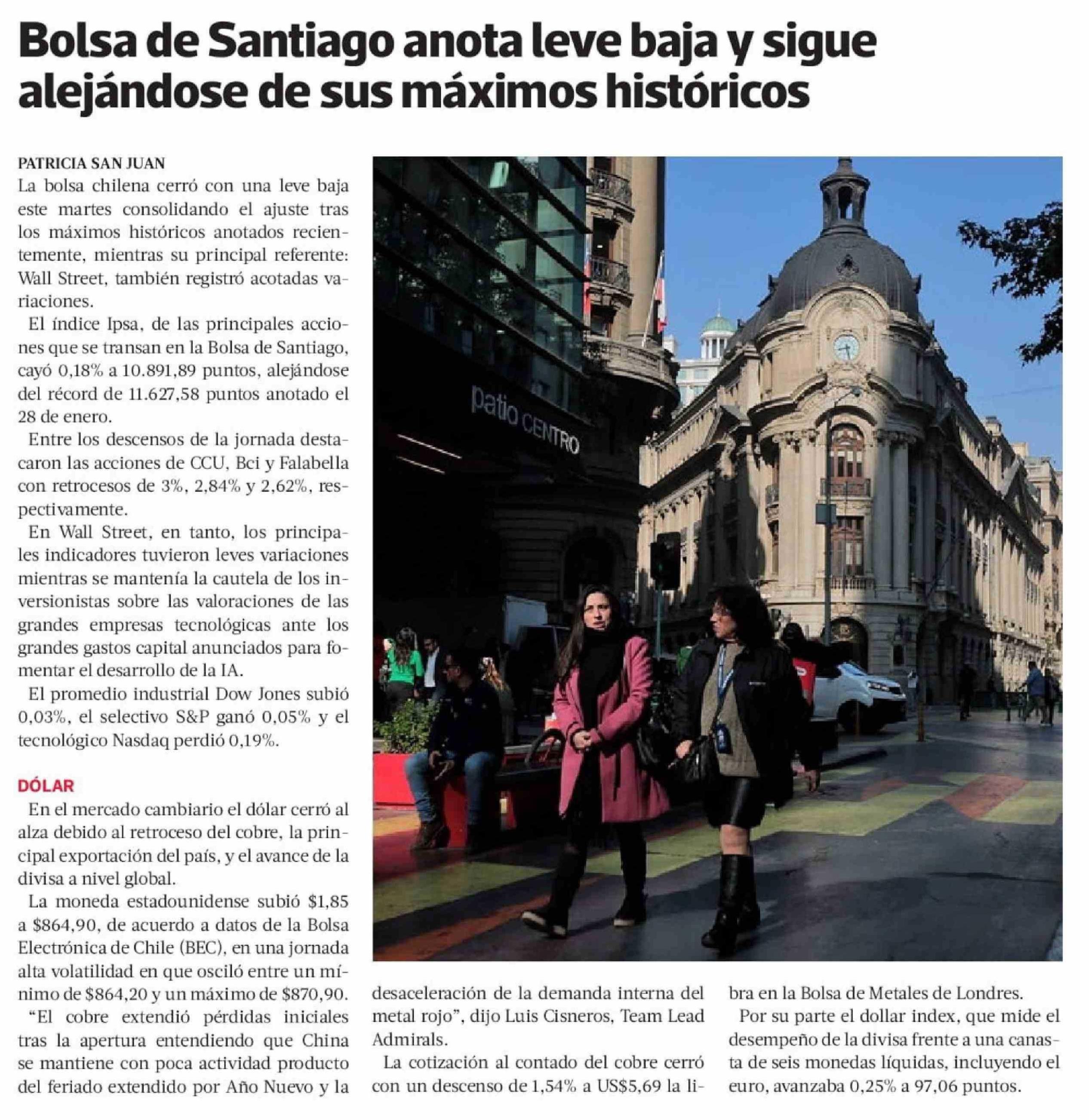 Bolsa de Santiago anota leve baja y sigue alejándose de sus máximos históricos 18-02-2026 La Tercera |