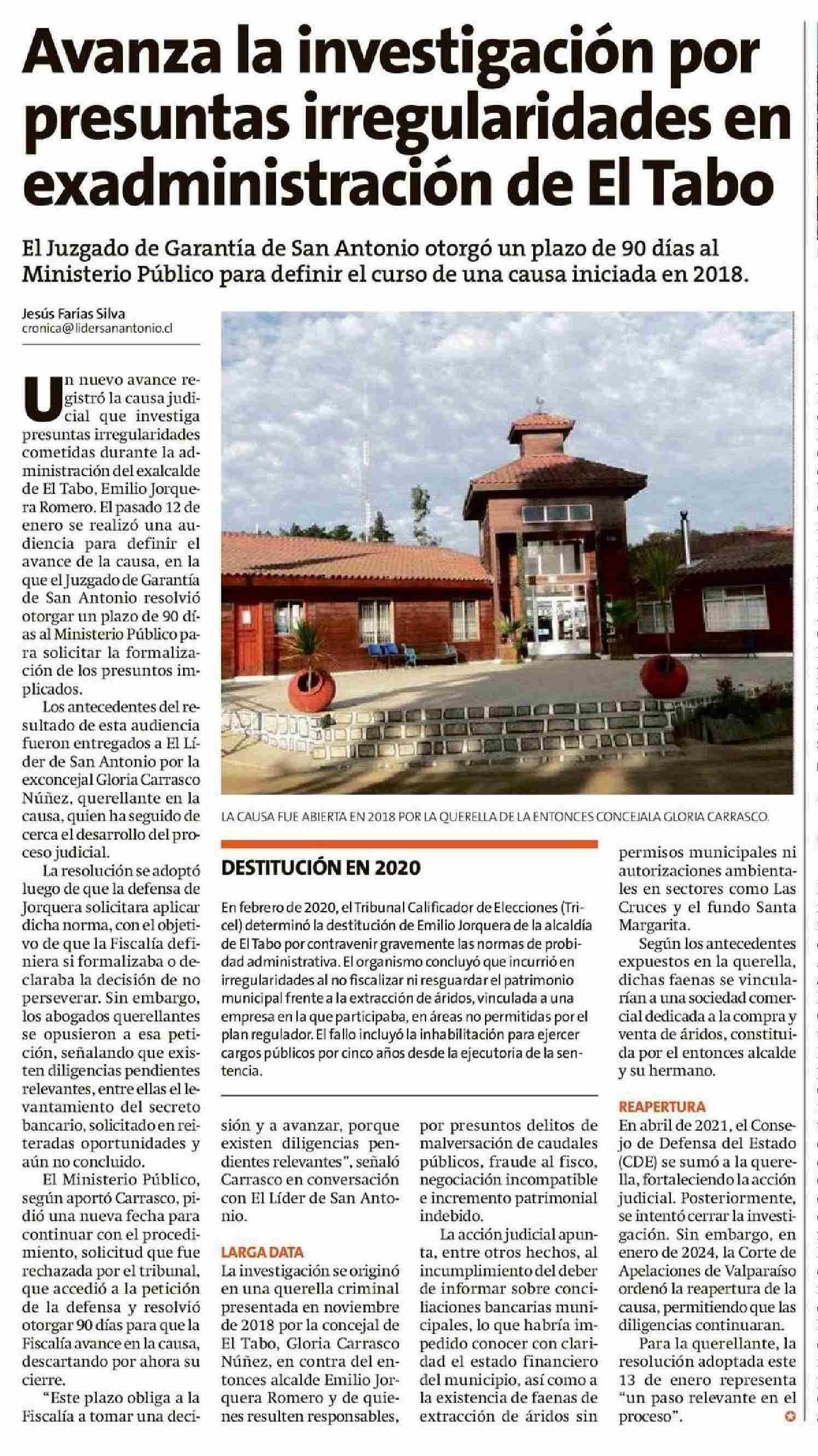 Título: Avanza la investigación por presuntas irregularidades en exadministración de El Tabo