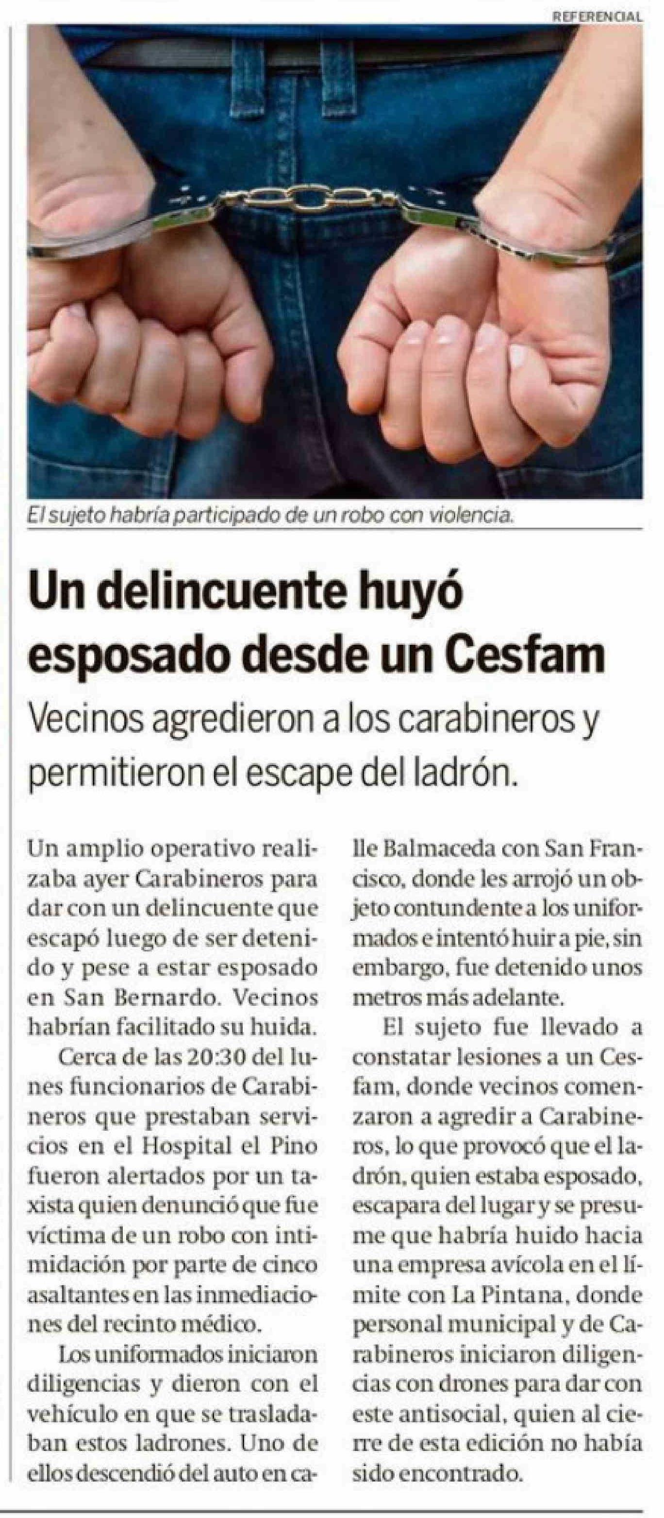 | Título: | Un delincuente huyó esposado desde un Cesfam |