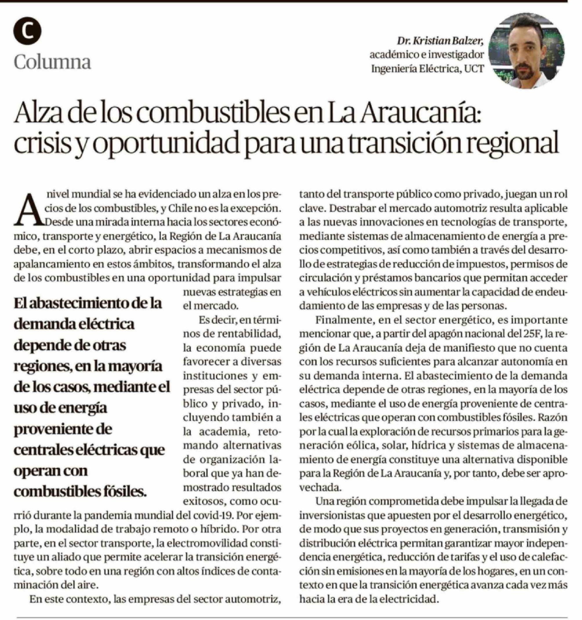 Columnas de Opinión: Alza de los combustibles en La Araucanía: crisis y oportunidad para una transición regional 02-04-2026 El Austral de la Araucanía |