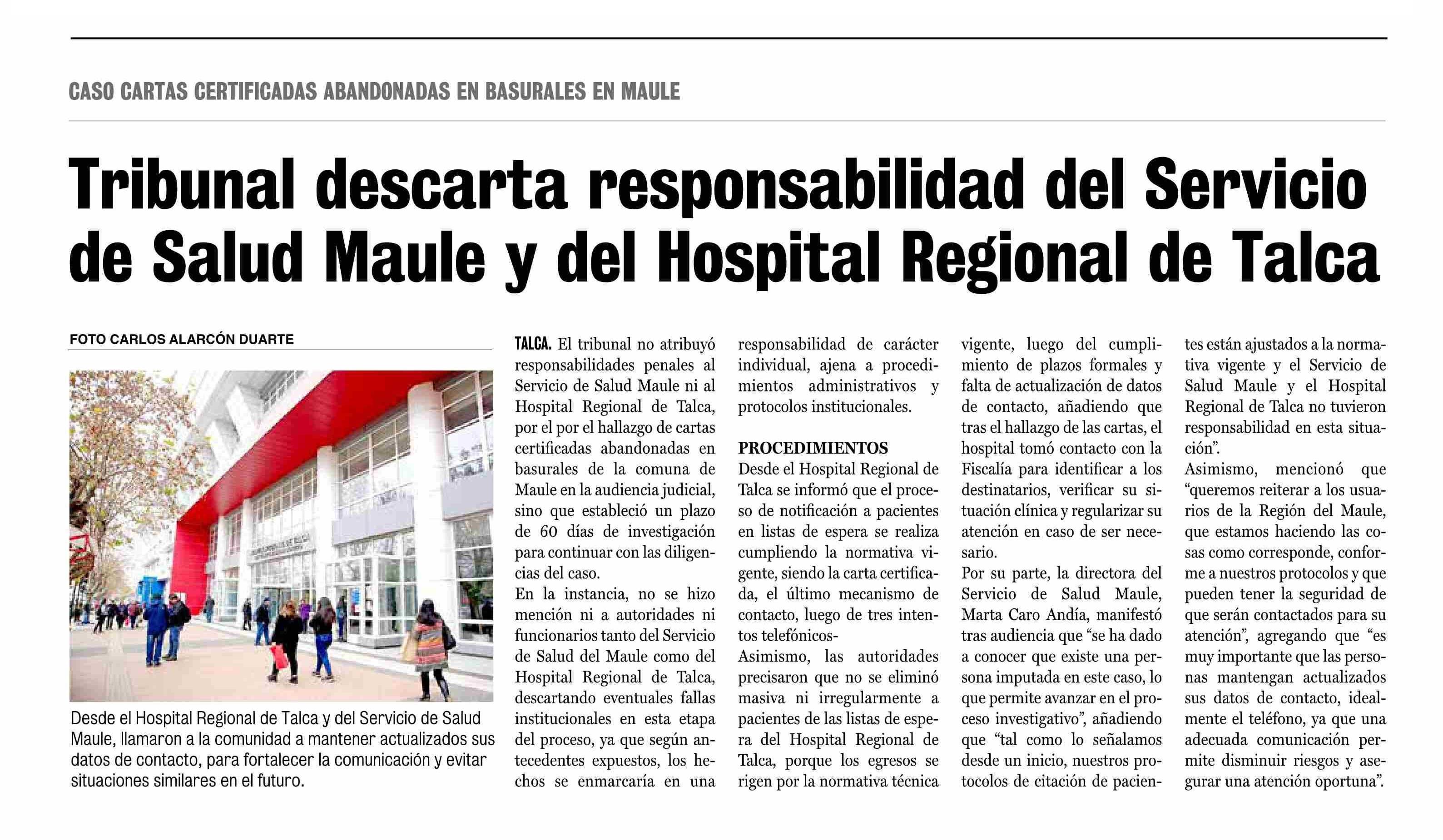 Tribunal descarta responsabilidad del Servicio de Salud Maule y del Hospital Regional de Talca 07-02-2026 La Prensa de Curicó |