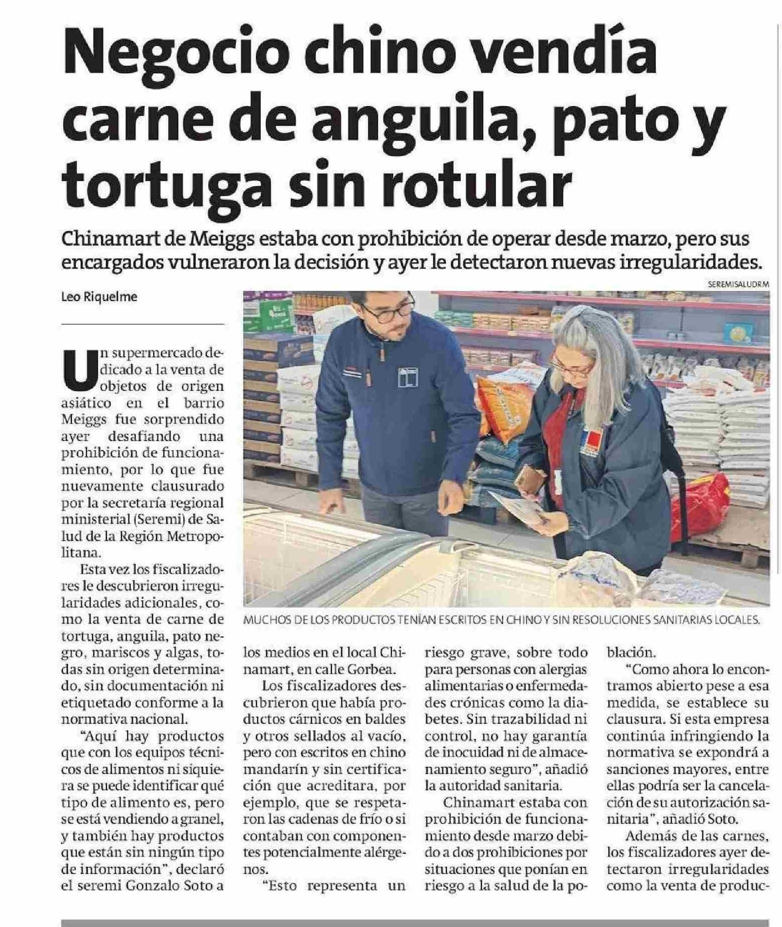 Negocio chino vendía carne de anguila, pato y tortuga sin rotular 30-05-2025 La Estrella de Arica |