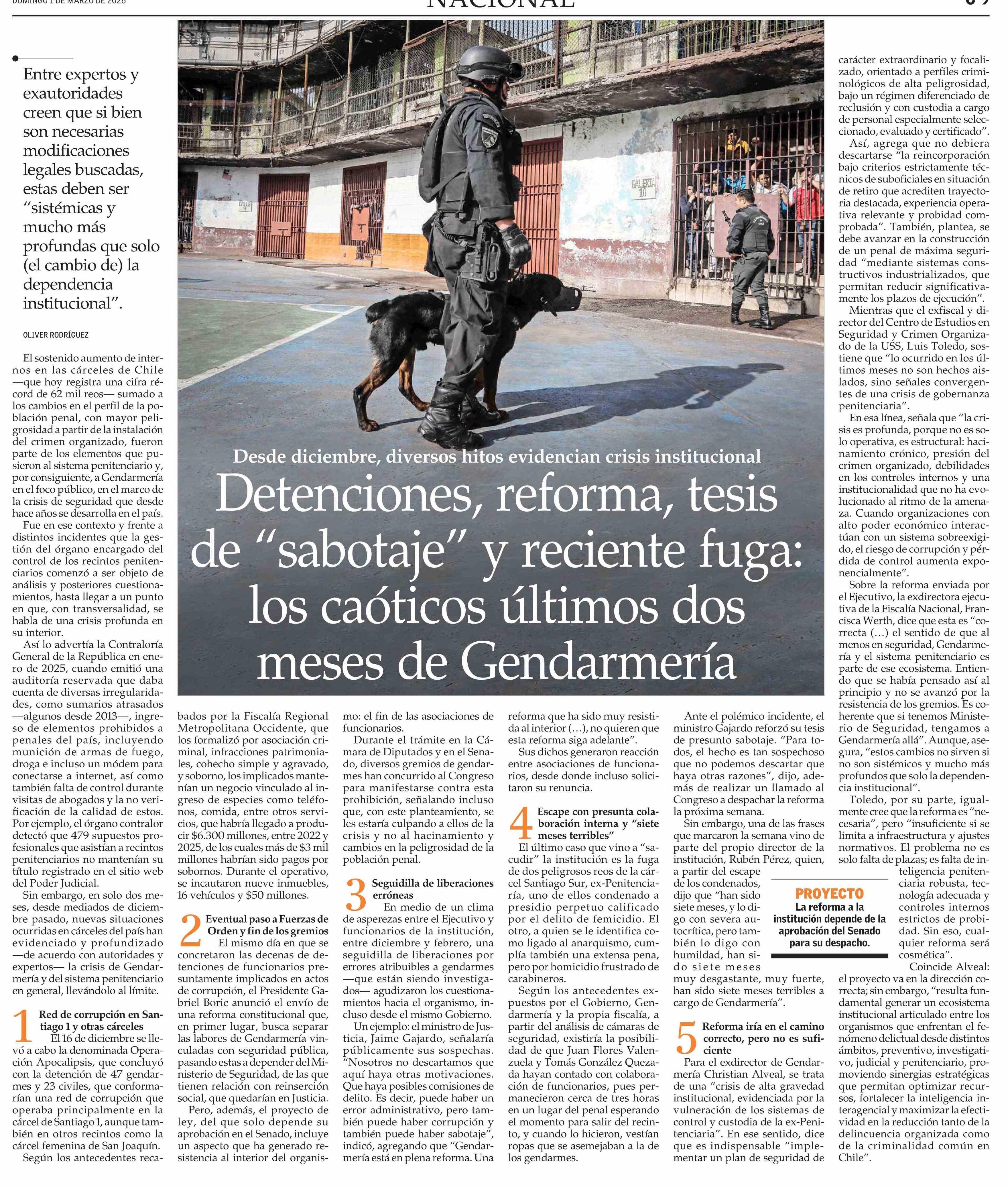 Detenciones, reforma, tesis de “sabotaje” y reciente fuga: los caóticos últimos dos meses de Gendarmería 01-03-2026 El Mercurio |