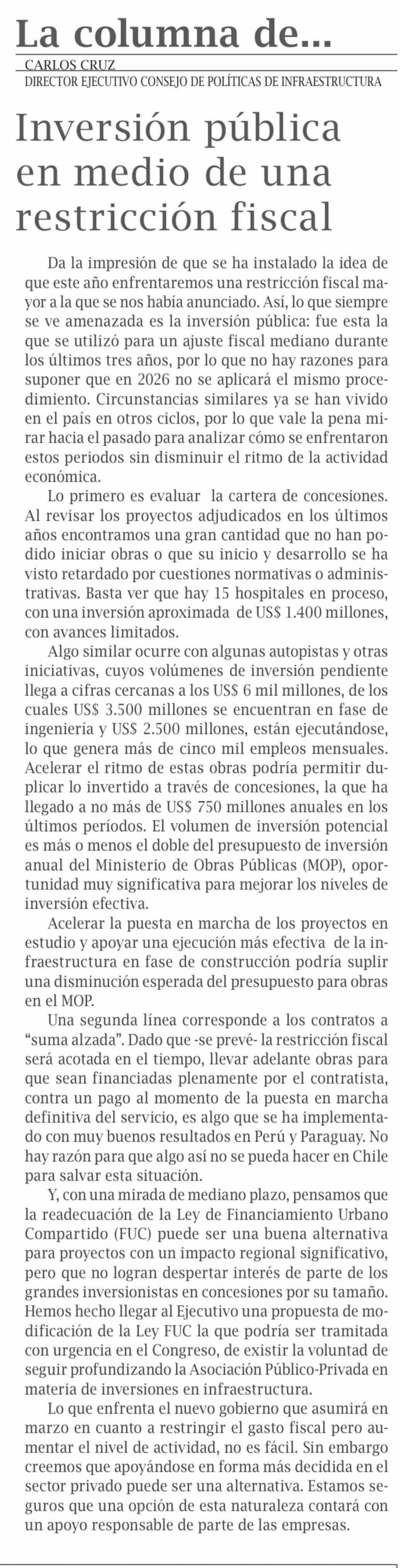 | Título: | Cartas: Inversión pública en medio de una restricción fiscal |