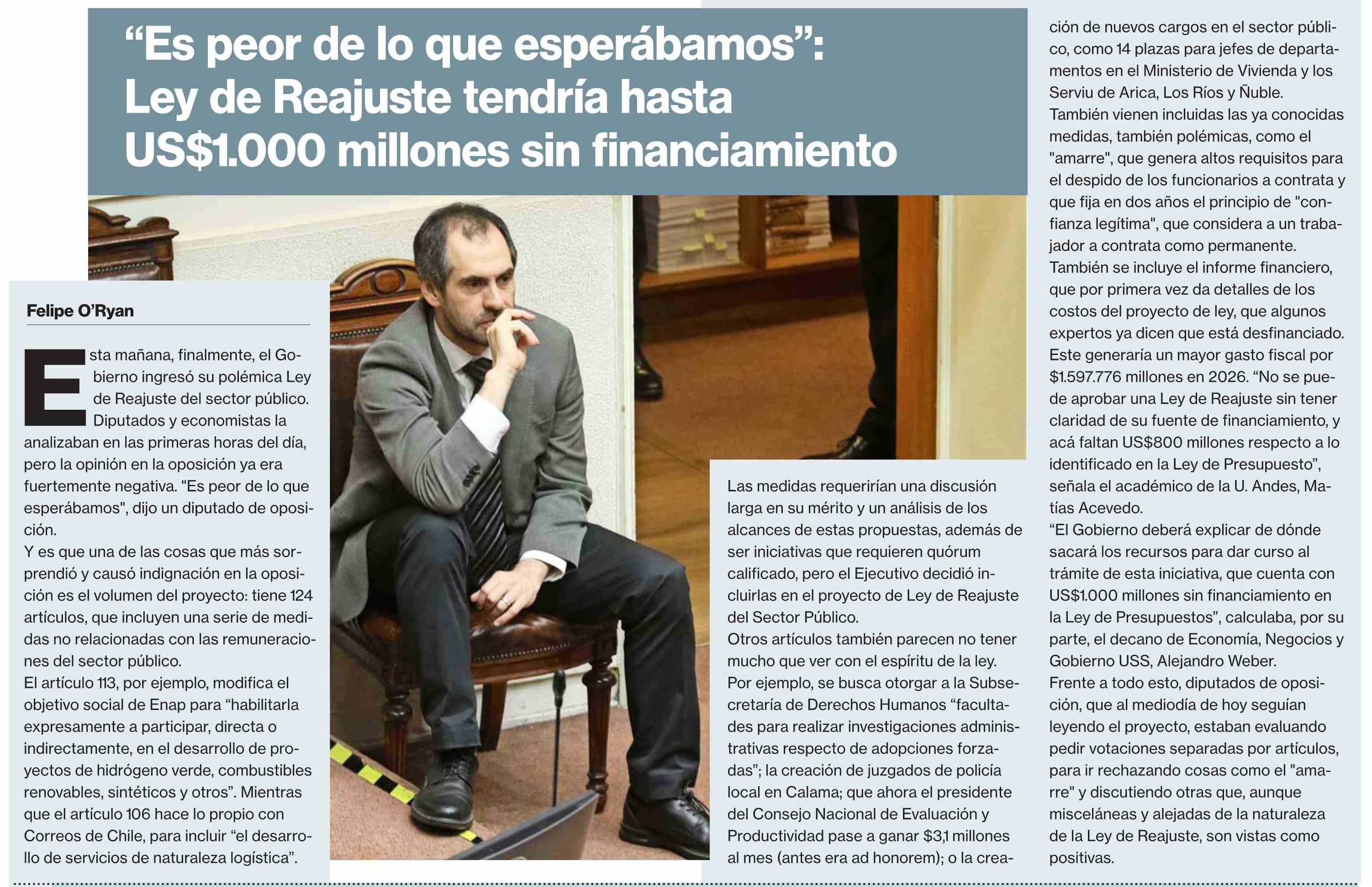 | Título: | "Es peor de lo que esperábamos": Ley de Reajuste tendría hasta US$1.000 millones sin financiamiento |