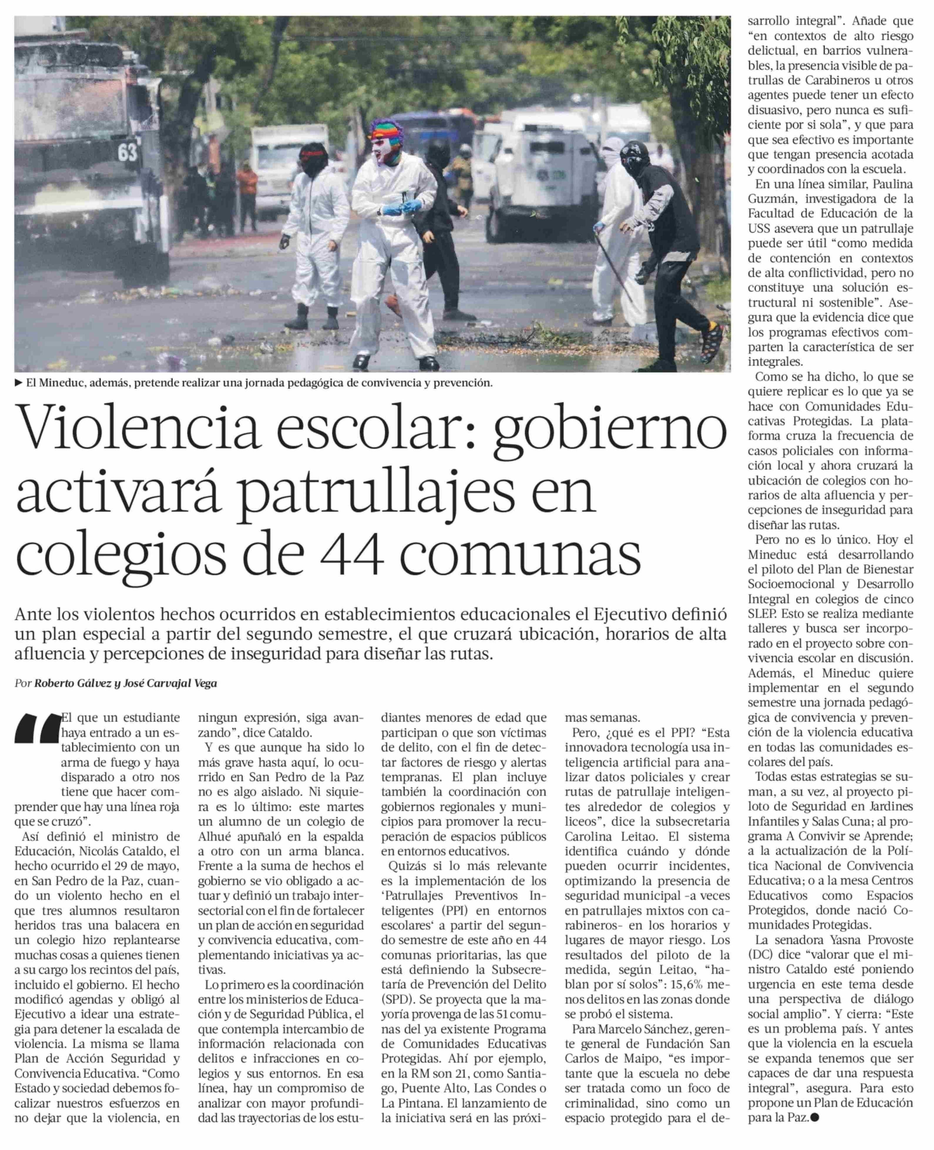 Violencia escolar: gobierno activará patrullajes en colegios de 44 comunas 21-06-2025 La Tercera |
