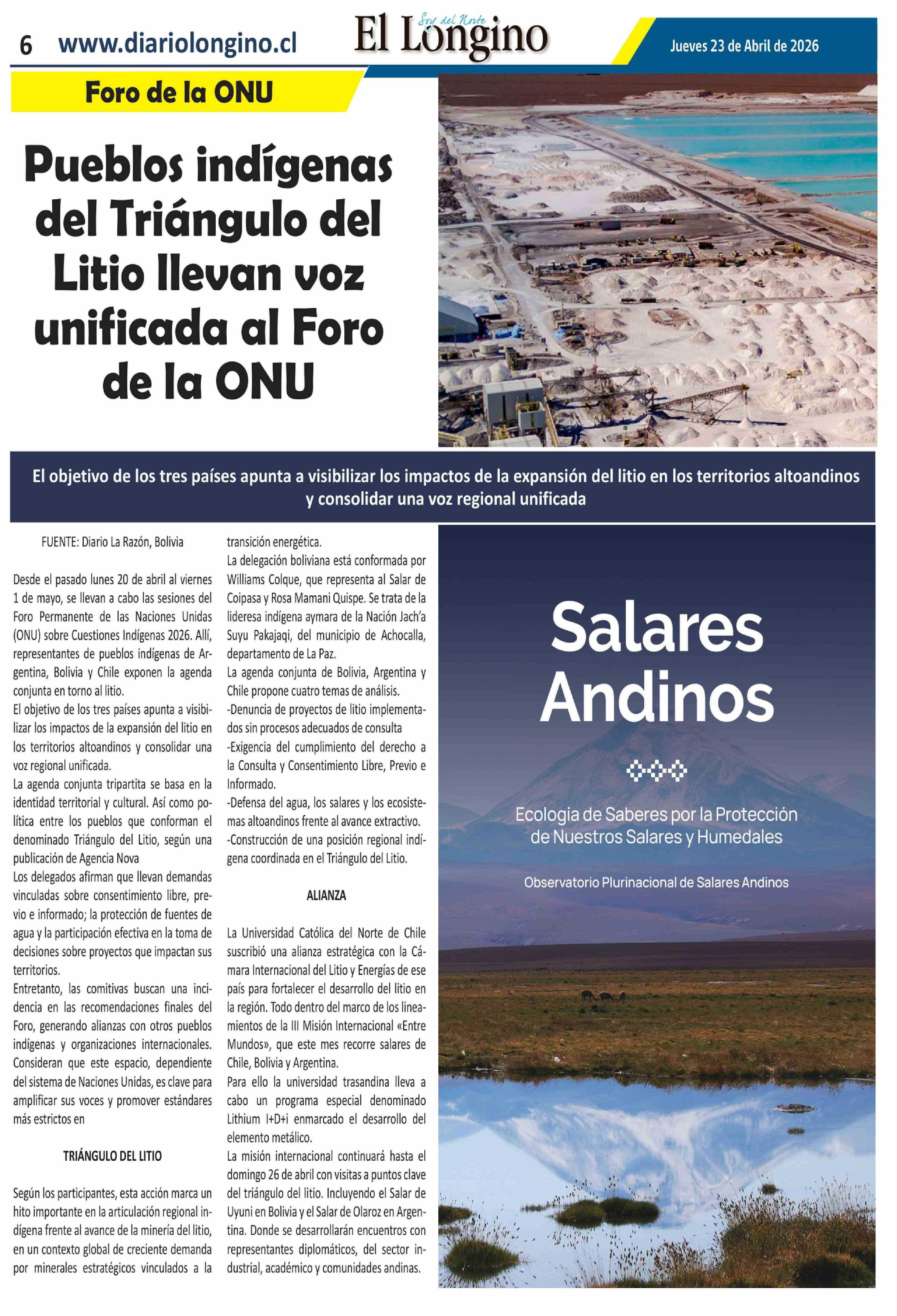 Pueblos indígenas del Triángulo del Litio llevan voz unificada al Foro de la ONU 23-04-2026 El Longino |