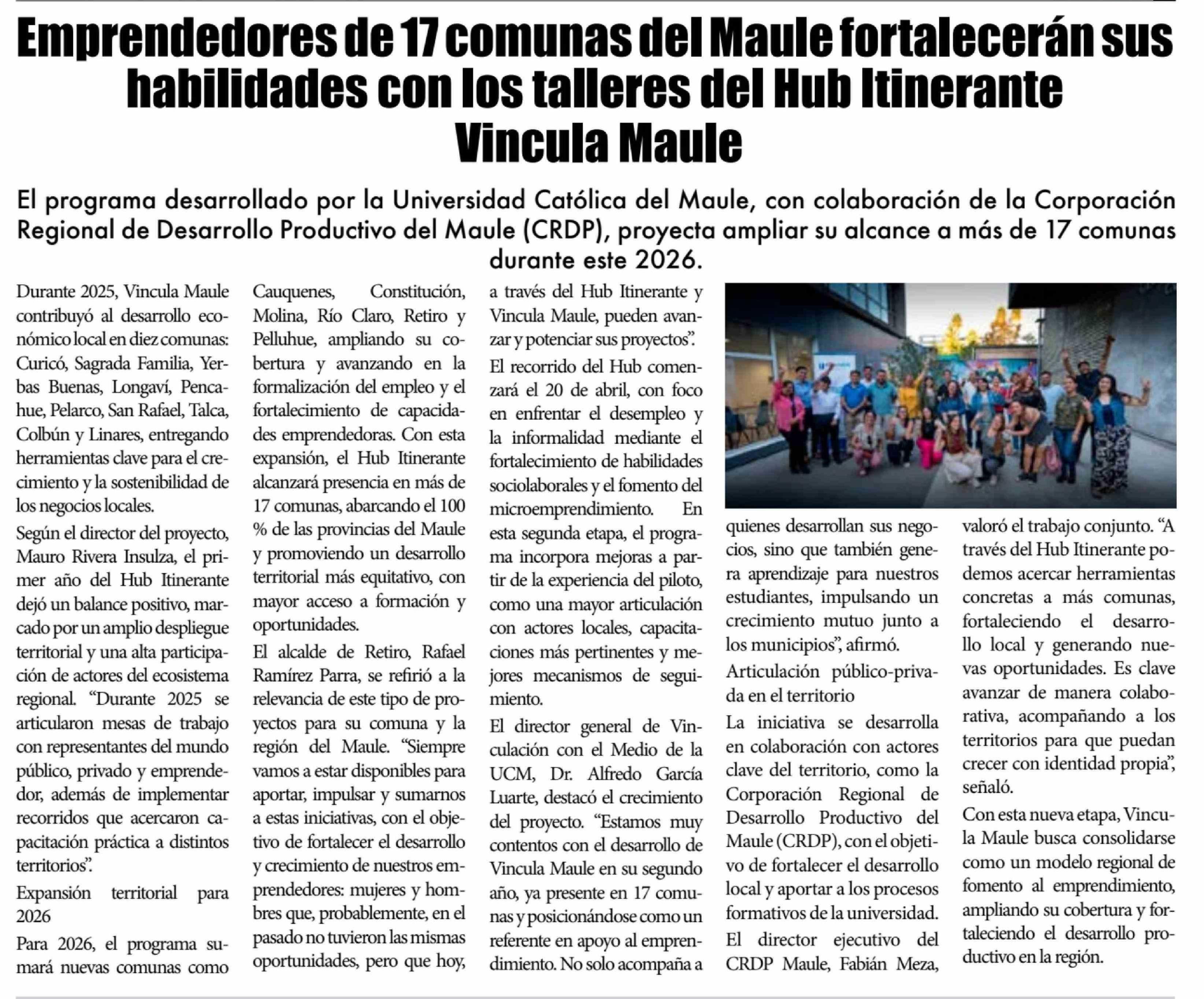 | Título: | Emprendedores de 17 comunas del Maule fortalecerán sus habilidades con los talleres del Hub Itinerante Vincula Maule |