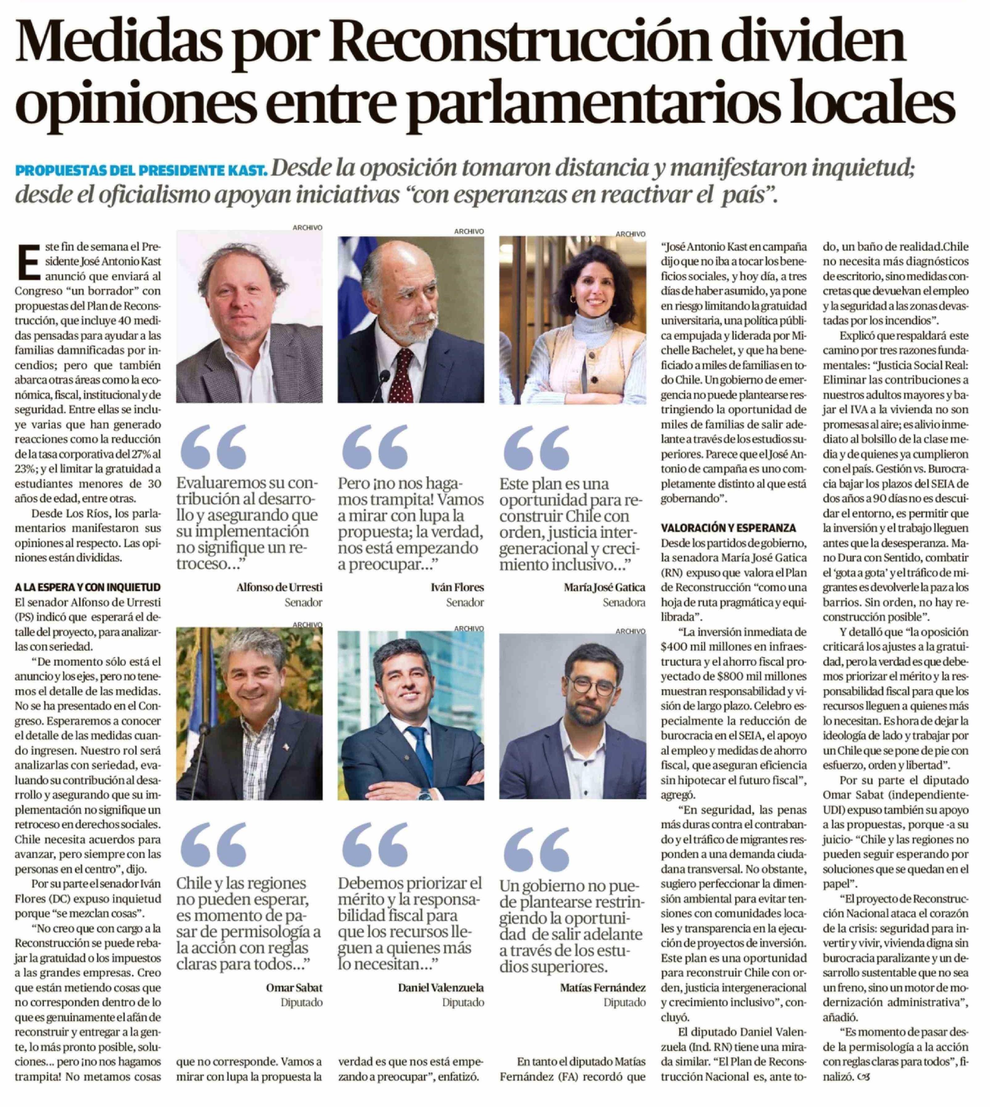 Medidas por Reconstrucción dividen opiniones entre parlamentarios locales 16-03-2026 Diario Austral Región de Los Ríos |
